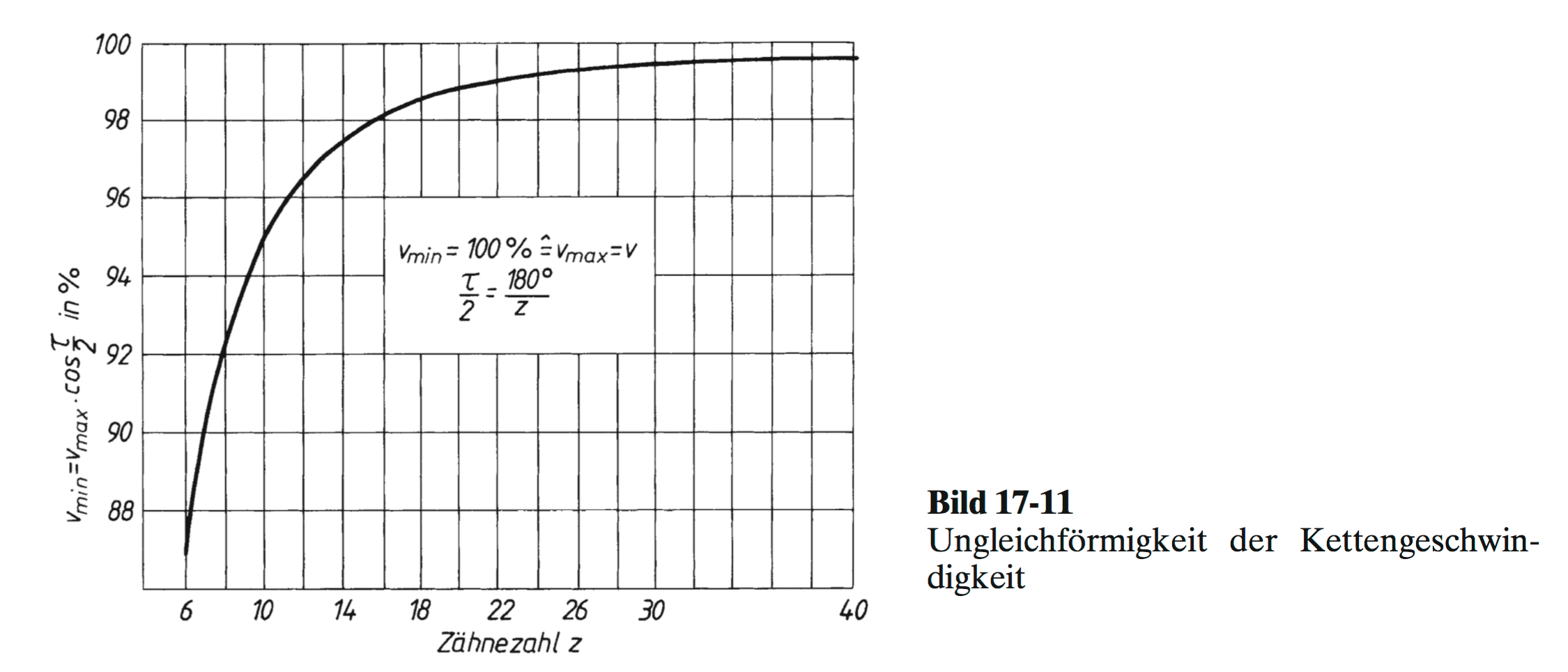 "Wegen des Polygoneffekts sollten Räder mit mindestens 17Zähnen gewählt werden. Für mittlere bis hohe Geschwindigkeit oder höchstzulässige Belastung soll das Kleinrad gehärtete Zähne und möglichst 21 Zähne aufweisen."