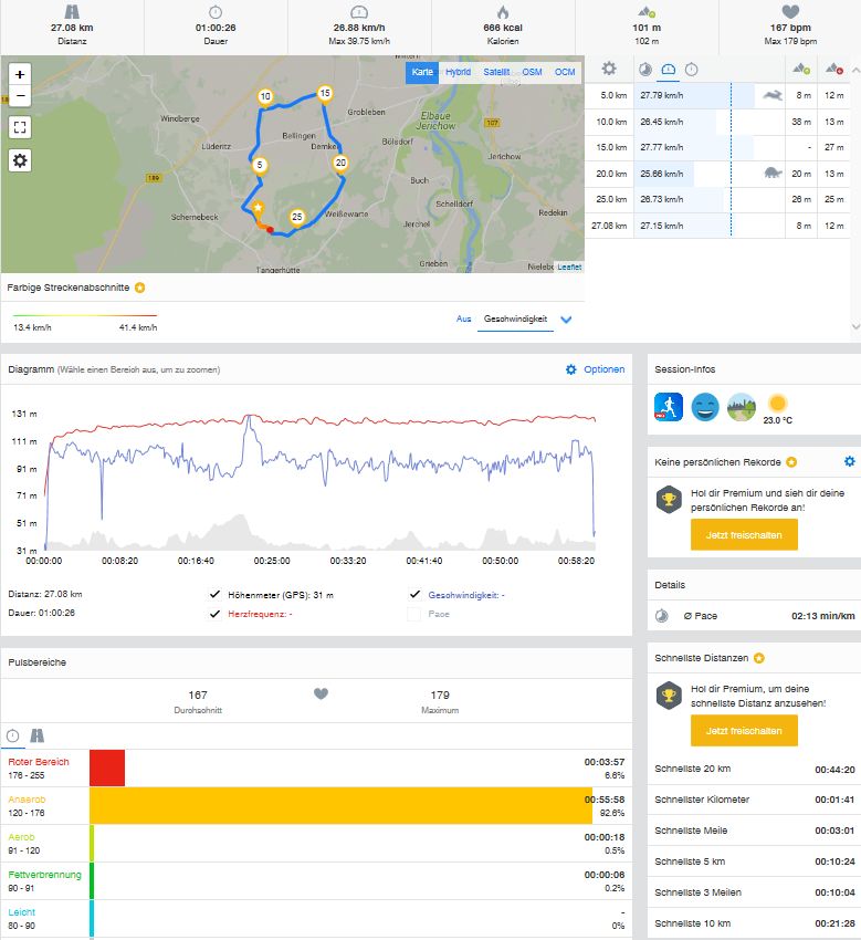 Auch eine ganz lustige Funktion, du kannst rennen gegen dich selbst starten. Habe ich mal mit dem Rad jetzt ein paar mal gemacht. Eine selbst zuvor gefahrene Strecke wählen und dann bekommst du Ansagen ob du vorne weg fährst, gleich überholt wirst usw.