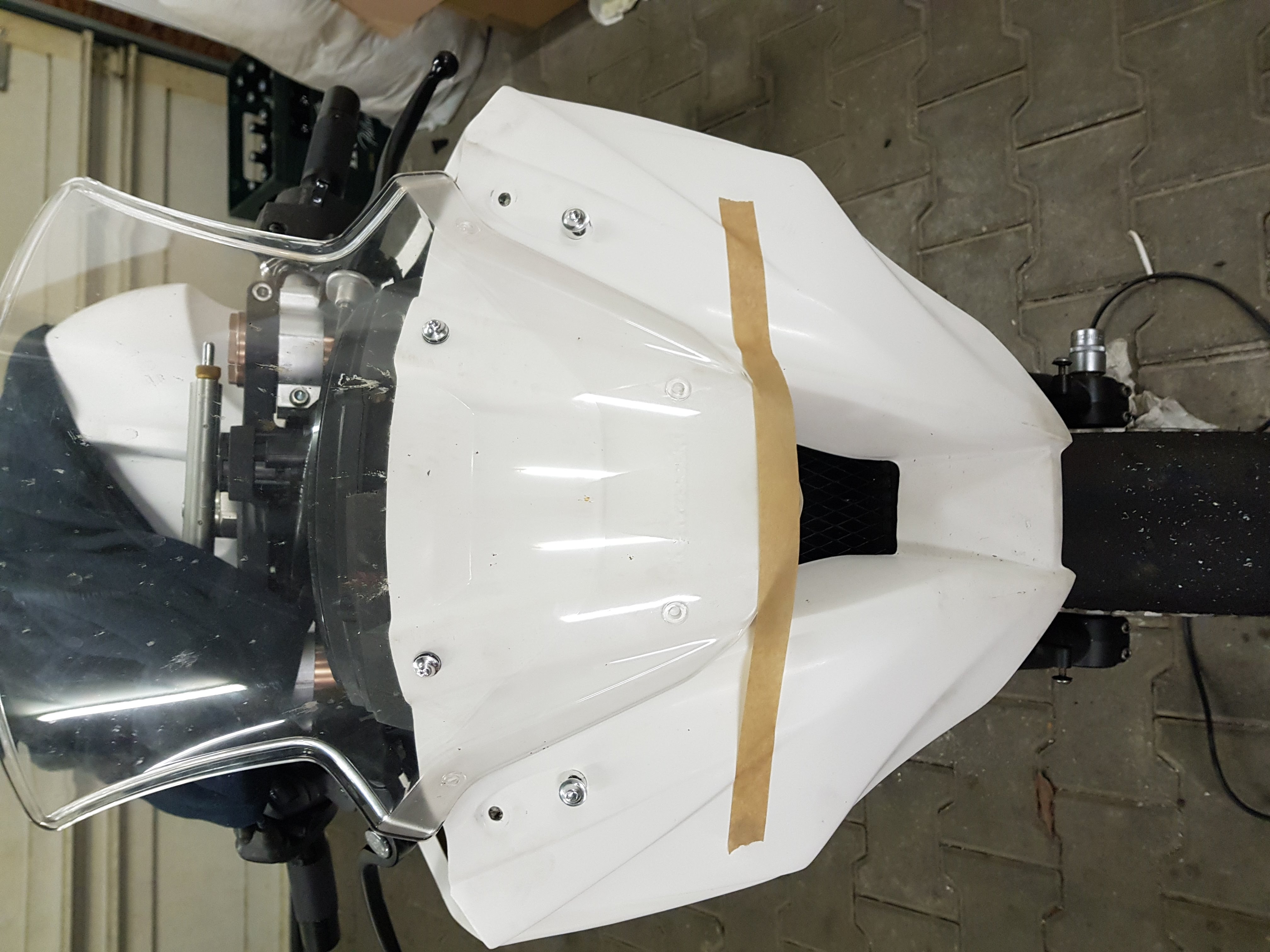 Als nächstes wurden noch die Übergänge von unter zu oberverkleidung angepasst. Aufgrund der paar  Schrauben ging das recht easy und auch direkt am Bike. Einfach wieder mit tape und Augenmaß markieren was weg muss. Etwas dahinter klemmen um Abstand zu haben und fröhlich drauf los dremeln.