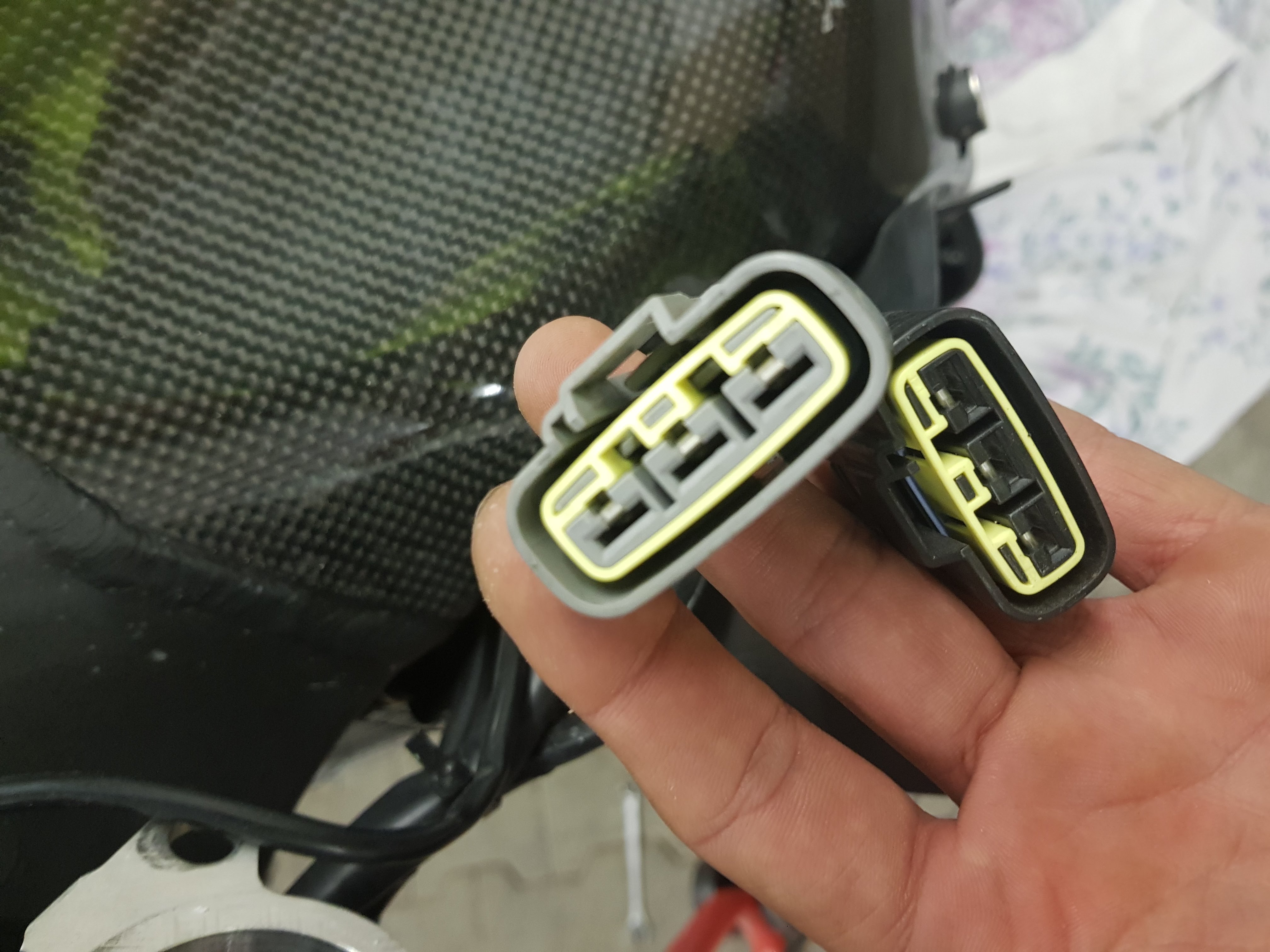 -und ich suche ein Adapterkabel (bzw. Verlängerungskabel) für den Gleichrichter (siehe Bild unten). Ursprünglich war dieser an der Verkleidung verschraubt, da diese Möglichkeit jetzt aber weg fällt, soll dieser entweder unter den Tacho verbaut werden oder hinter den Motor. Alternativ tun es auch Einzelstecker, Pins und eine entsprechende Crimpzange. Sollte sich sowas gar nicht finden, löte ich einfach ein entsprechend langes stück Kabel ein. Da aber in ferner Zukunft eine KitEcu einzug halten soll, wäre es schade am Original Kabelbaum rum zulöten.