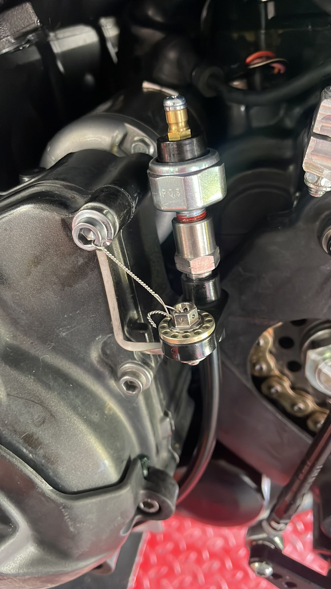 Ich würde den Sensor direkt in den Motor Schrauben, genauso wie bei den meisten Serien Motoren. Wenn Du da eine Undichtigkeit bekommst oder der Sensor gar abreißt, dann ist kein Öldruck mehr vorhanden und der Motor schnell beschädigt plus eine Sauerei auf der Strecke.