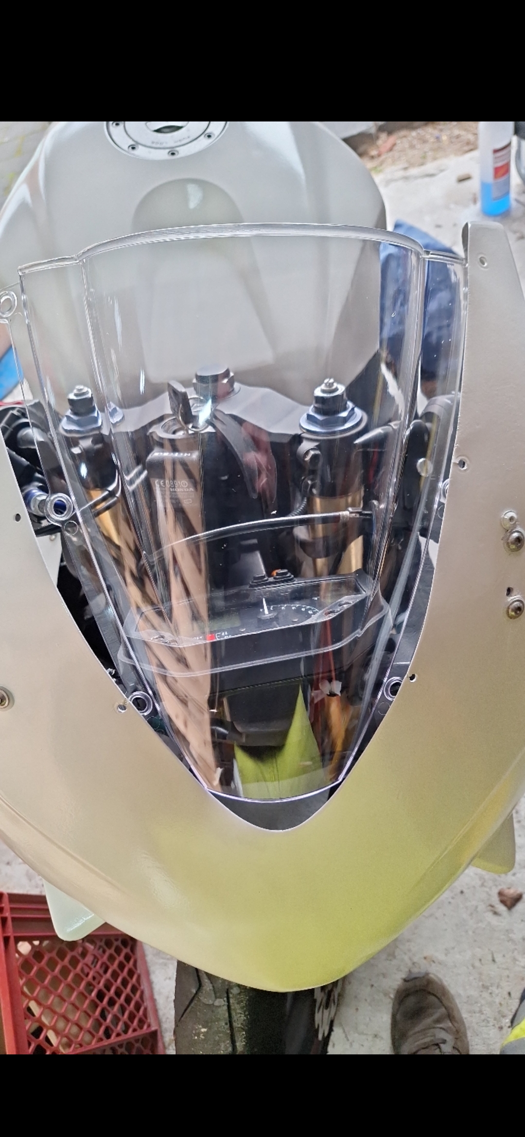 Hi, wir sitzen grad an der PC37 meiner Frau. Hab ne Verkleidungsscheibe bestellt, die unten aber nicht passt. Jetzt frage ich mich natürlich was die anderen PC37 Fahrer verbaut haben, das unten passt.