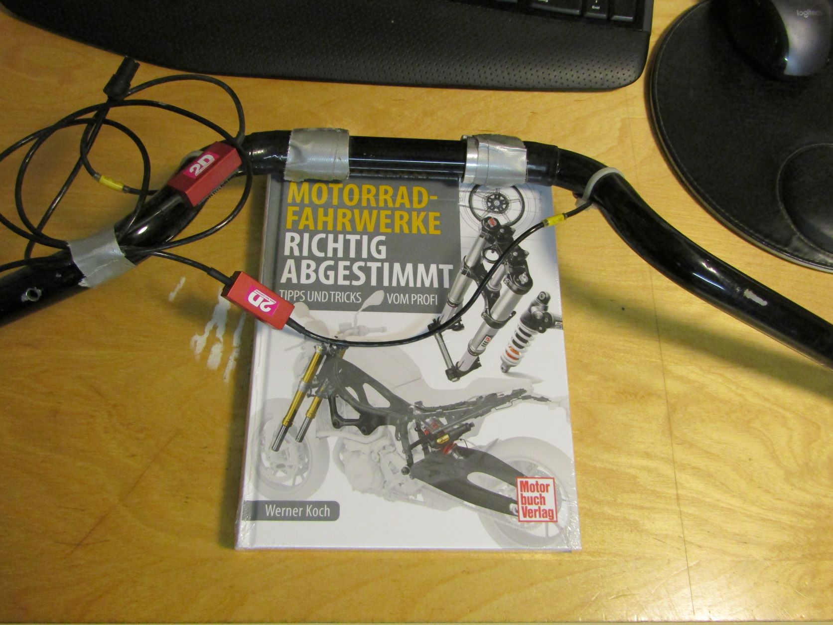 Wir hatten vor längerer Zeit in MOTORRAD einen Handlingtest mit unterschiedlich schnellen/guten Fahrern auf der Honda CBF 600. Dort war ein Lenker mit 2D Sensoren montier (Foto unten), der die Lenkkraft über Dehnmessstreifen gemessen hatten. Je schneller die Fahrer durch den Slalomparcours gefahren sind, desto höher waren die Lenkkräfte. Die "Tester" waren ganz normale Motorradfahrer, die von Lenkimpuls, Massenkraft, rotierende Massen keine blassen Schimmer hatten. Aber je zackiger sie den Slalom und die Ausweichsimulation gefahren sind, desto mehr haben sie am Lenker gezogen. Bei denen, die nicht zurecht kamen, haben wir dann auf den Lenkimpuls hingewiesen, also nicht am Tank drücken oder sich in die gewünschte Kurvenrichtung lehnen, sondern außen ziehen oder innen drücken- und schwupps, waren die um Welten schneller und schräger unterwegs. Wie gesagt, auch über dieses Thema ist im Buch einiges aufgeführt, genau so, wie zum Thema Druck auf die Fußrasten, um den Grip zu erhöhen. Was ganz einfach nicht möglich ist, weil man sich auch nicht an den eigenen Haaren aus dem Sumpf ziehen kann. Wobei ich selbst fast auf dieses Idee hereingefallen bin. Beim Motocross Training ist mir aufgefallen, dass ich beim Kurvenfahren, speziell in den Anliegern, enger fahren kann, wenn ich das kurvenäußere Knie an den Tank presse. Was ja soviel heißen würde, dass ich damit eine Kraft auf das Motorrad ausüben könnte. Abends in der Werkstatt bin ich dann nochmal auf die EXC 450 aufgesattelt und hab probiert was passiert, wenn ich vorn am Tank sitze und das linke Knie/Oberschenkel an den Tank presse? Eigentlich garnix. Oder? Genau, die Krafteinleitung links am Tank hatte zur Folge dass ich als Gegenkraft den Lenker nach Links einschlug. Einen Lenkimpuls also nach rechts erzeugte. Und genau dieses "unbewusste" Lenken,dass auch der wirklich erfolgreiche WM-