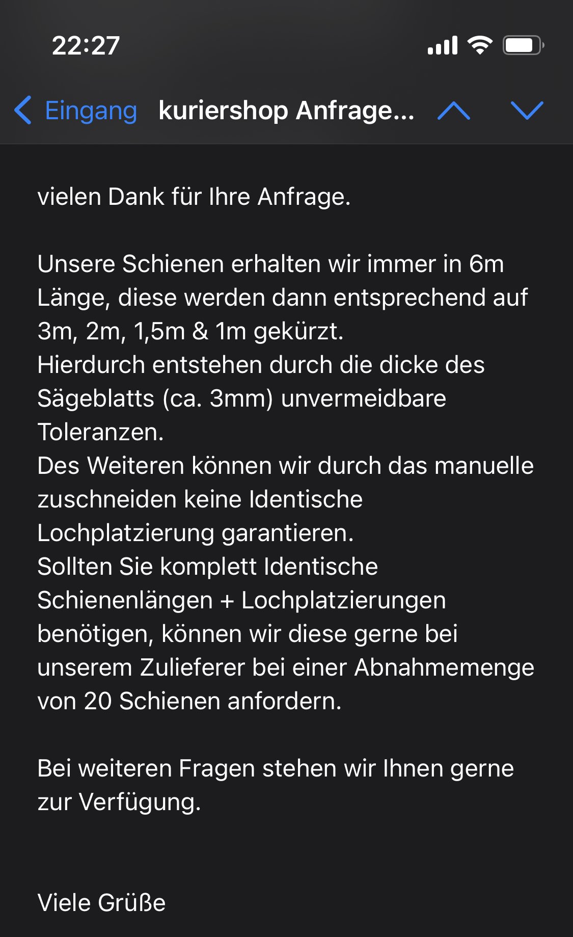 Aber die 1,5 Meter gibts doch auch als Standardware und nicht als Zuschnitt, also müssten sie doch alle gleich sein?Zugeschnittene Profile (z.B. 1,5m) sind Mist, da sie aus längeren Profilen zurechtgeseägt werden. Teilweise passen sie Stücke dann nicht mit anderen Stücken zusammen, was dann nicht wirklich gut ist. Standardprofile hingegen passen immer zusammen.