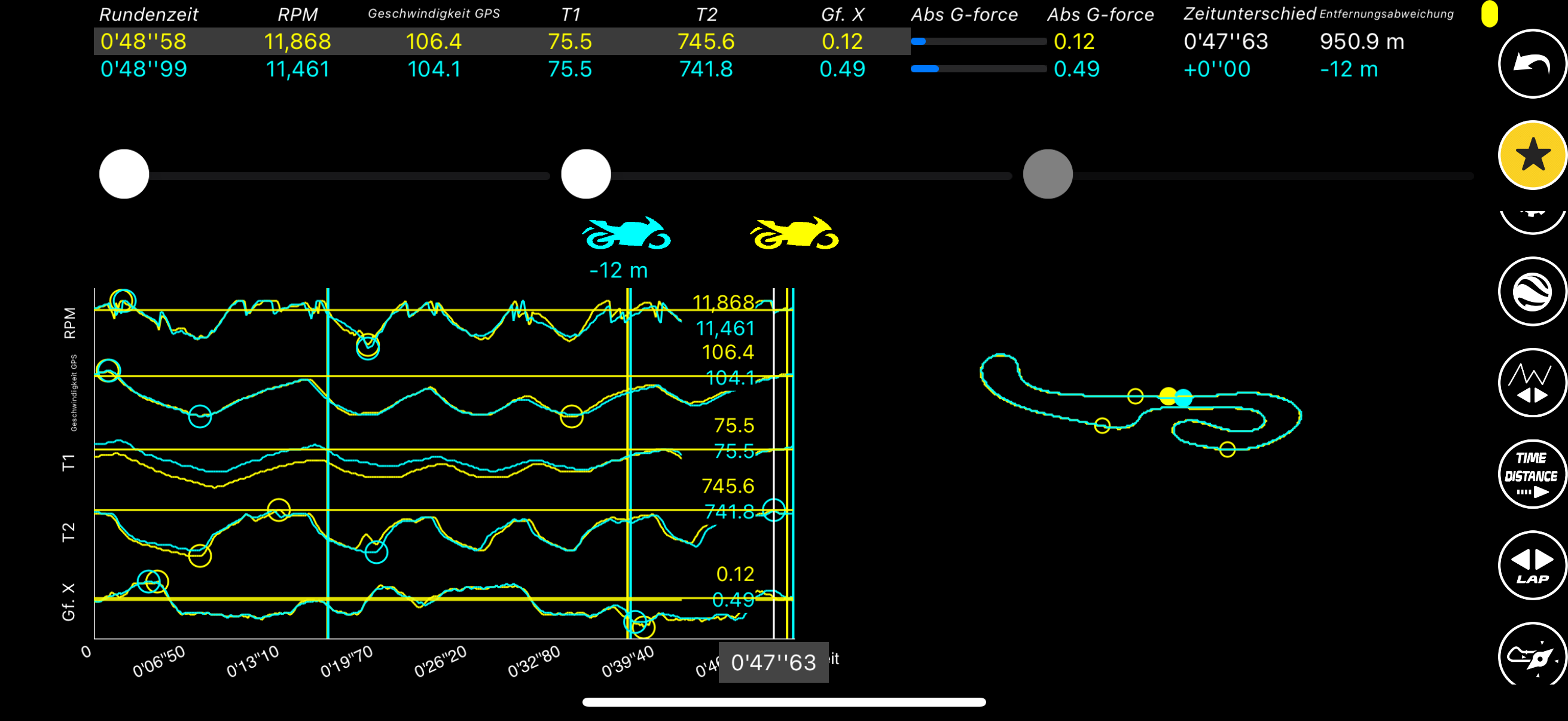 Idealzeit, Sektoren, Vmax, Beste Runde Led oder Anzeige am Display.