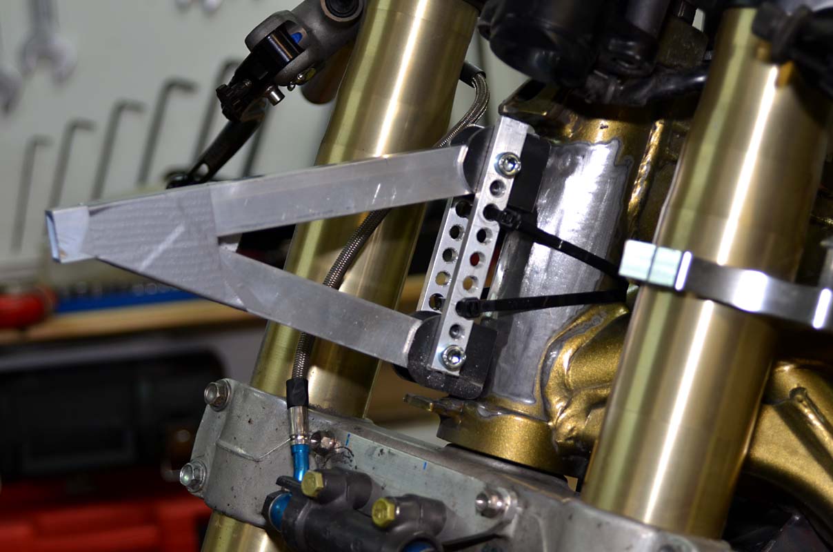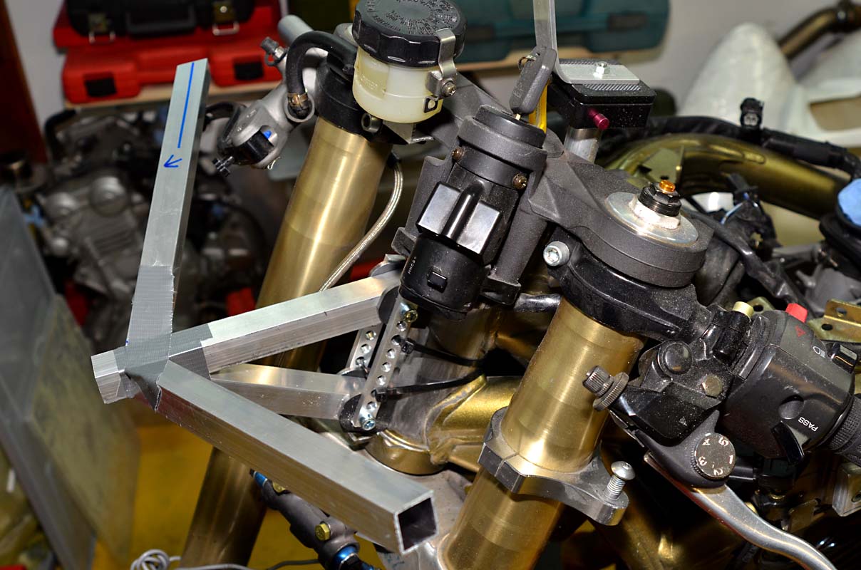 Zwischen die Ausleger noch ein Verbindungsrohr an dem gleich die Instrumente befestigt werden können und dann noch rechts und links einen kleinen Adapter zur Verkleidung. Damit sollte ein leichter und stabiler vorderer Verkleidungshalten vorhanden sein.
