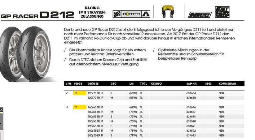 Der neue D212 GP Racer Slick soll durch seine Überarbeitung ein höheres Maß an Handlichkeit bei gestiegener Stabilität in die Waagschale werfen - mehr Performance ist immer gut und das Größte daran ist: Der Preis bleibt für die GSXR-Piloten trotz anderem Maß konstant. Wir werden den Satz unter 300€ anbieten können, um auch hier wieder einen Schritt in Richtung Bezahlbarkeit zu machen. Sicherlich bietet ein M oder S sicherlich noch mehr Performance, es treibt aber den Reifenumsatz auch bei den "Sparfüxxen" in die Höhe, was nicht unser Ziel war, ist und sein wird. Am Ende des Tages sind die Reifen wieder für alle gleich und es ist an jedem Einzelnen den Reifen am oder im Grenzbereich zu bewegen.