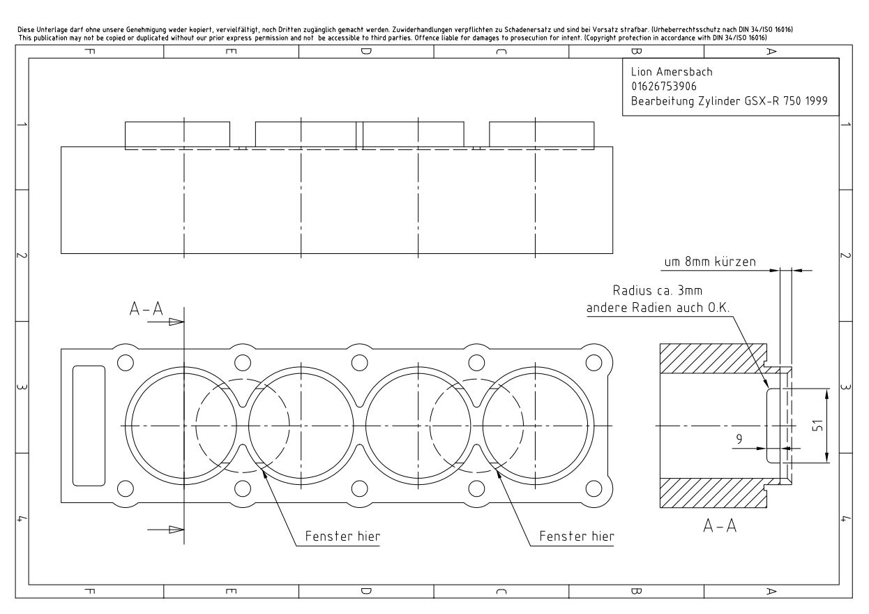 Um den Druckausgleich zwischen den Zylindern zu verbessern werden alle Hemden unten gekürzt und zwischen Zylinder 1&2 sowie 3&4 Fenster ausgefräst. Beim Quetschkante ausmessen habe ich auch gleich die tiefste Position der Kolben markiert. So konnte ich nach dem Zerlegen von unten nochmal genau nachmessen wo ich wie viel gefahrlos entfernen kann.