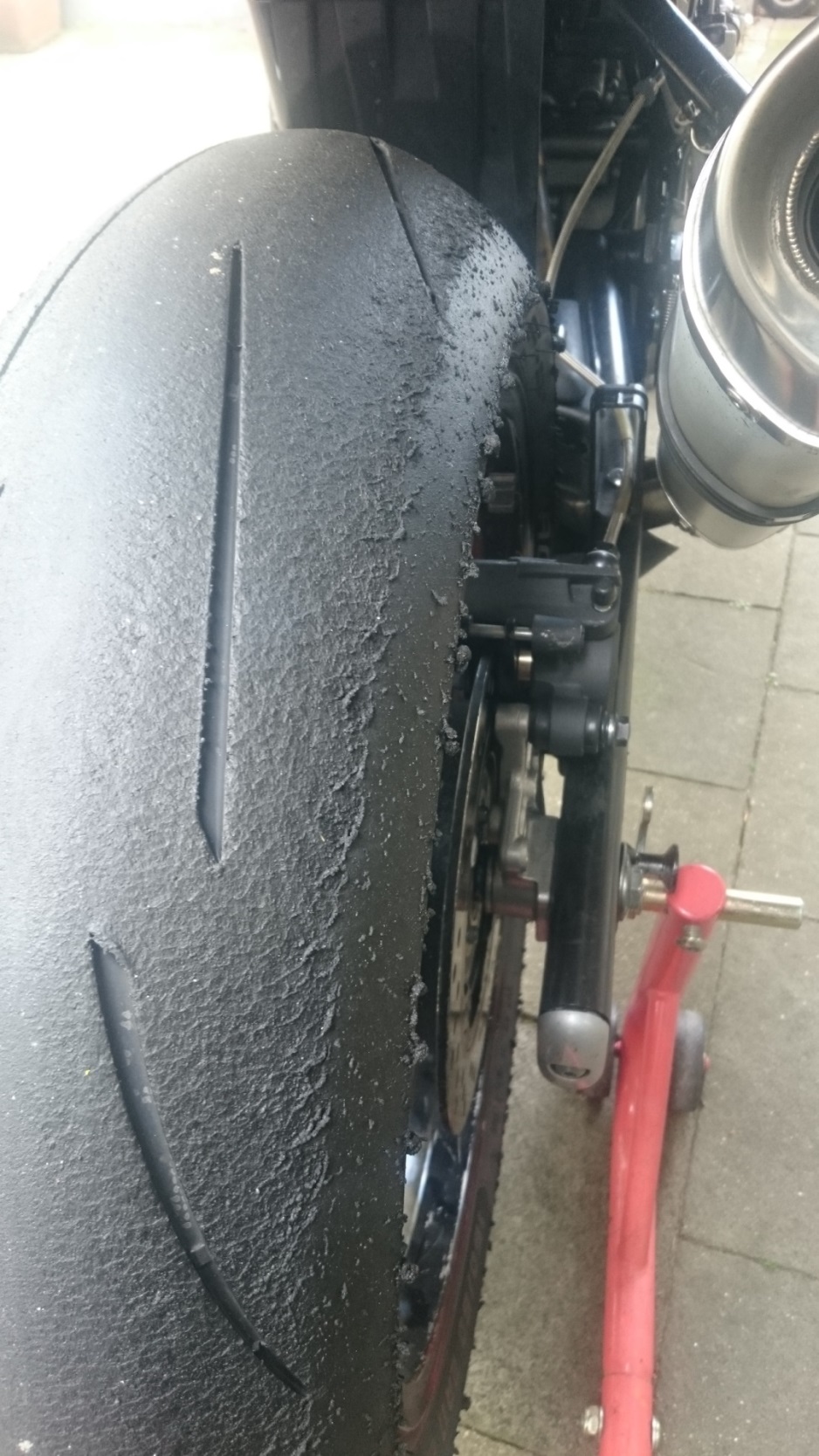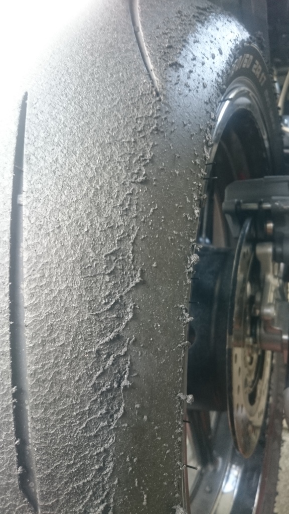 Auf diesem Streifen vom Reifen rollst du einfach nur und hast kein bis kaum Gas anliegen. Dann wird der Slick in dem Bereich so glatt. Gehst du beim nächsten Event immer früher ans Gas kannst du zugucken wie dieser "glatte" Bereich immer kleiner wird.