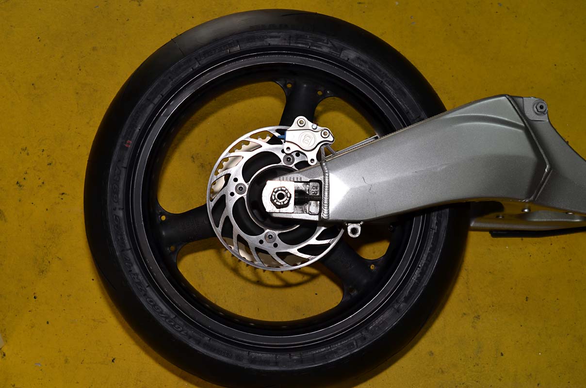 Damit ich die Position der Zange festzulegen kann, das ZR7 Hinterrad in die Ersatzschwinge eingebaut und die kleine Bremszange auf die Scheibe gelegt.