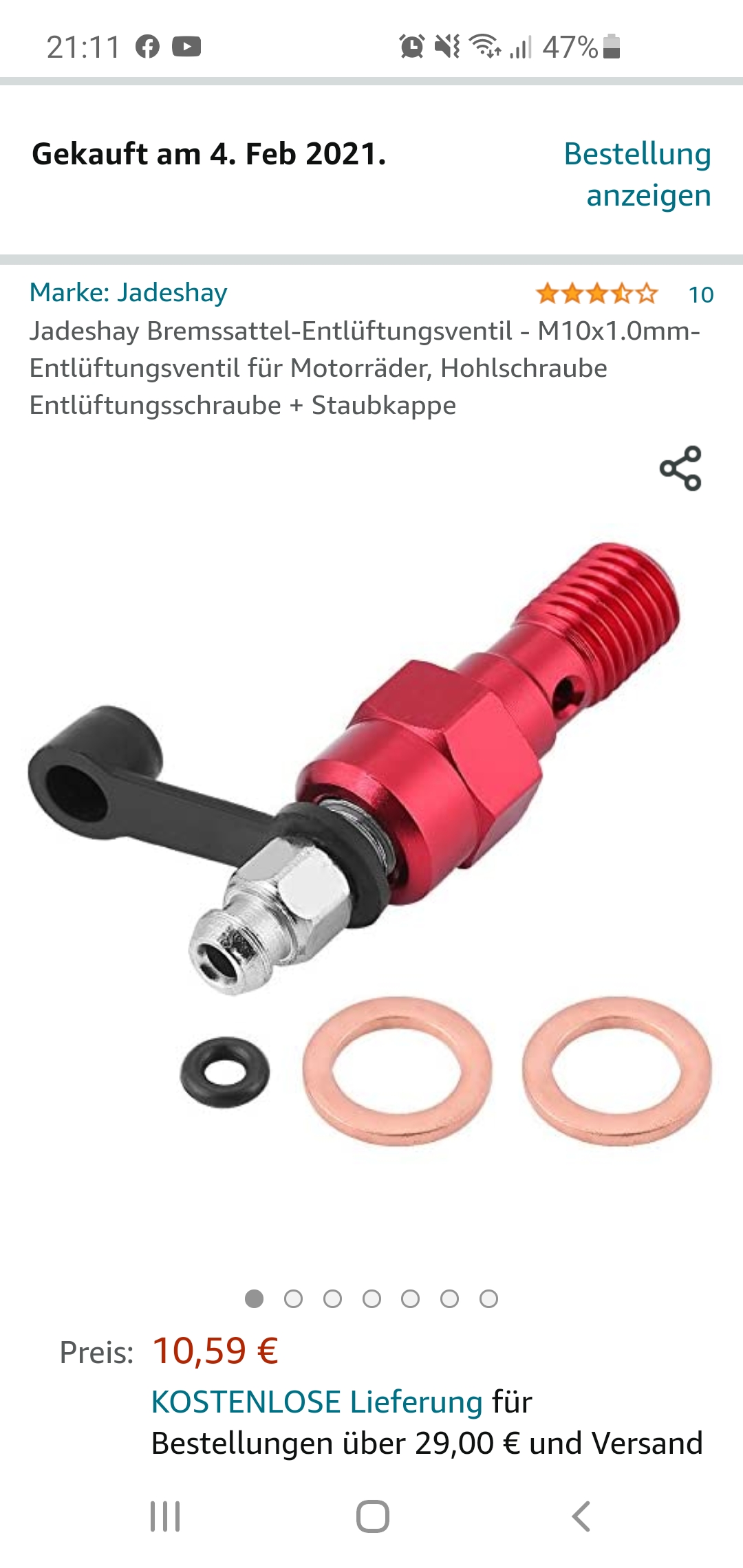 Ringschlüssel, Benzinschlauch, Gefäß. Und das ganze geht ohne Patzerei.jackherer hat geschrieben:Ich entlüfte grundsätzlich immer an den Hohlschrauben. Habe allerdings keine speziellen, sondern lege ordentlich Tücher unter und entlüfte dann einfach durch leichtes aufdrehen der Hohlschraube. Da suppt es dann einfach raus,geht aber sehr gut. Besonders beim Neubefüllen des Systems wirkt das Wunder!