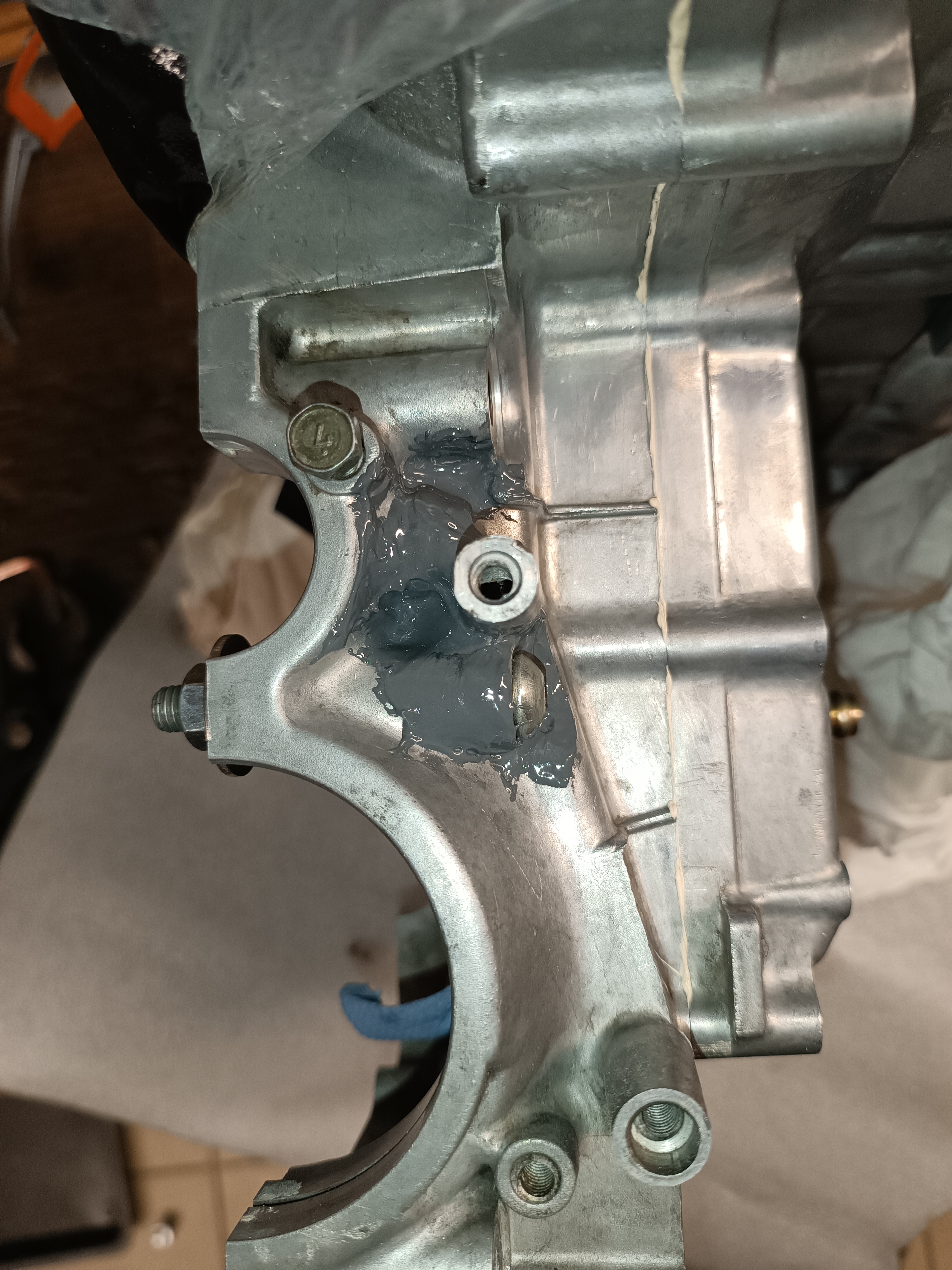 Beim zusammensetzen der unteren Motorhälfte (Getriebe) wollte ich nicht wie im Handbuch vorgehen (Handbuch schreibt vor den Motor auf den Kopf zu stellen, das Getriebe einzulegen und dann die untere Hälfte mit den Schaltgabeln von oben herabzusenken. Mir kam das wegen der Schaltgabeln unnötig kompliziert vor und ich wollte es (wie beim letzten Mal) genau umgedreht machen. Der einzige Faktor der hier zum Problem wird sind die Stifte. In der oberen (mittleren) Motorhälfte befinden sich Stifte, die in Bohrungen in den Getriebelagern greifen, um diese zu fixieren. Es ist leider sehr schwer diese Löcher so zu treffen. Es hilft nur ausrichten und Augenmaß (eine meiner Schwächen). Dabei habe ich mich leider minimal verschätzt und beim Zusammenbau des Motors mit anschließendem vorsichtigen anziehen der Schrauben verklemmte sich der Stift und PENG - das Gehäuse war durch. Spannungsriss. Ja - Sau dumm. Ja - Ich war zu ungeduldig und habe mich darüber SCHWARZ geärgert.