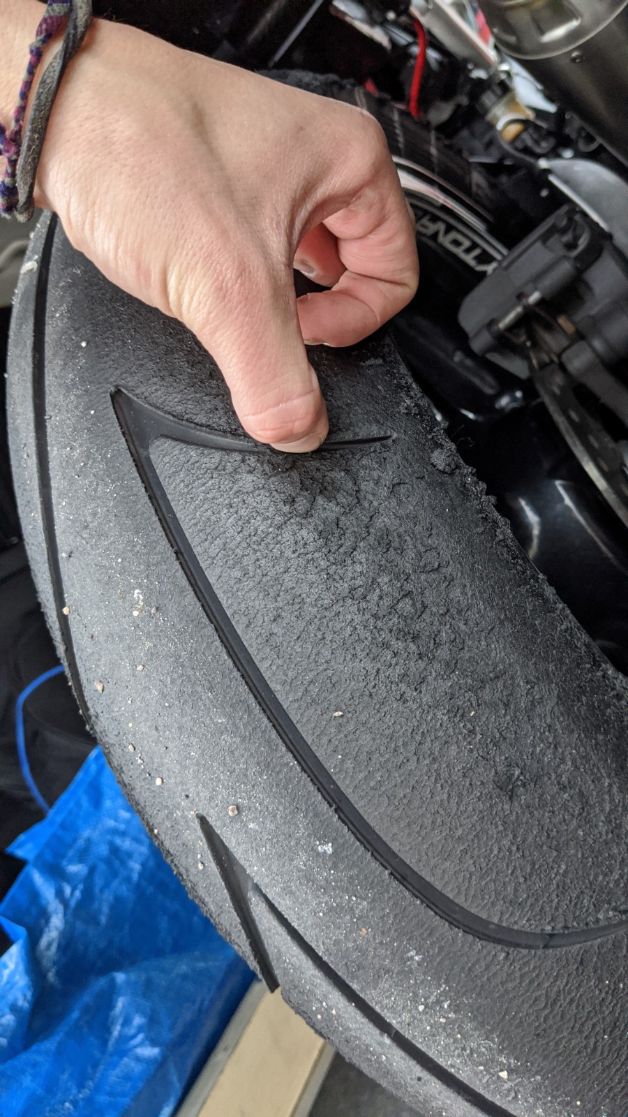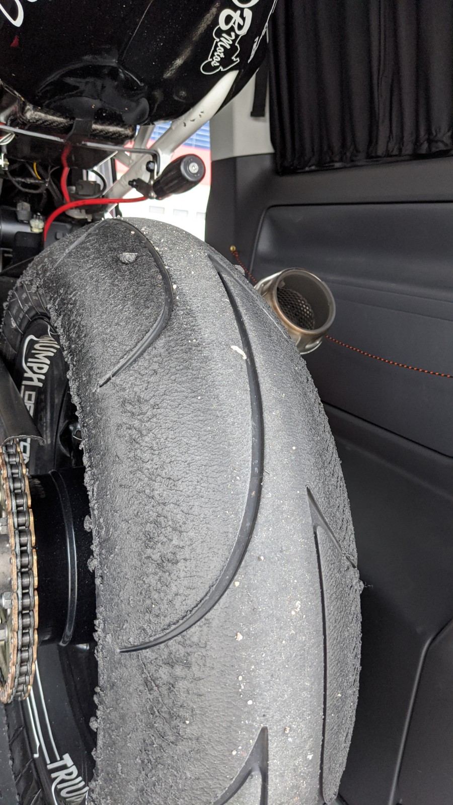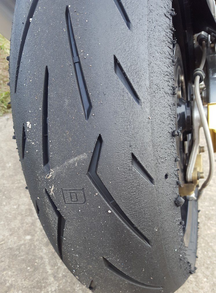 Hab daher Druckstufe 1 Klick hinten zu gemacht und Bypass 1 Klick zugemacht, um dem entgegen zusteuern (K-Tech 35DDS Bypass Einsteller, geht wohl gleichermassen auf Druck und Zugstufe im Low-speed Bereich). Resultat dass das Moped definitiv stabiler liegt, aber ich auch einen kleinen Highsider hatte (den ich gluecklicherweise irgendwie gestanden habe), in Kurve 3 wo das Hinterrad abrupt rumgekommen ist. Muss aber sagen das war ganz am Ende, da sah der Reifen schon so aus wie auf den folgenden Bildern, wahrscheinlich ist er einfach fertig. Da wo ich meinen Daumen hinhalte ist das Profil bei 0.