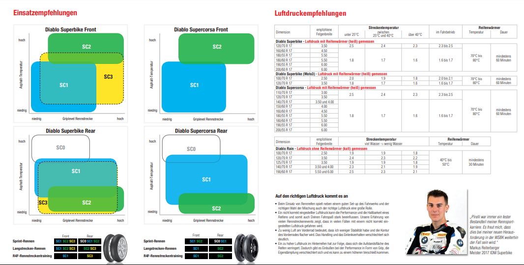 Meine Erfahrungen resultieren aus den Empfehlungen der Hersteller bei den jeweiligen Reifenpräsentationen bei denen ich meistens vor Ort bin, die finden in der Regel auf Rennstrecken statt.