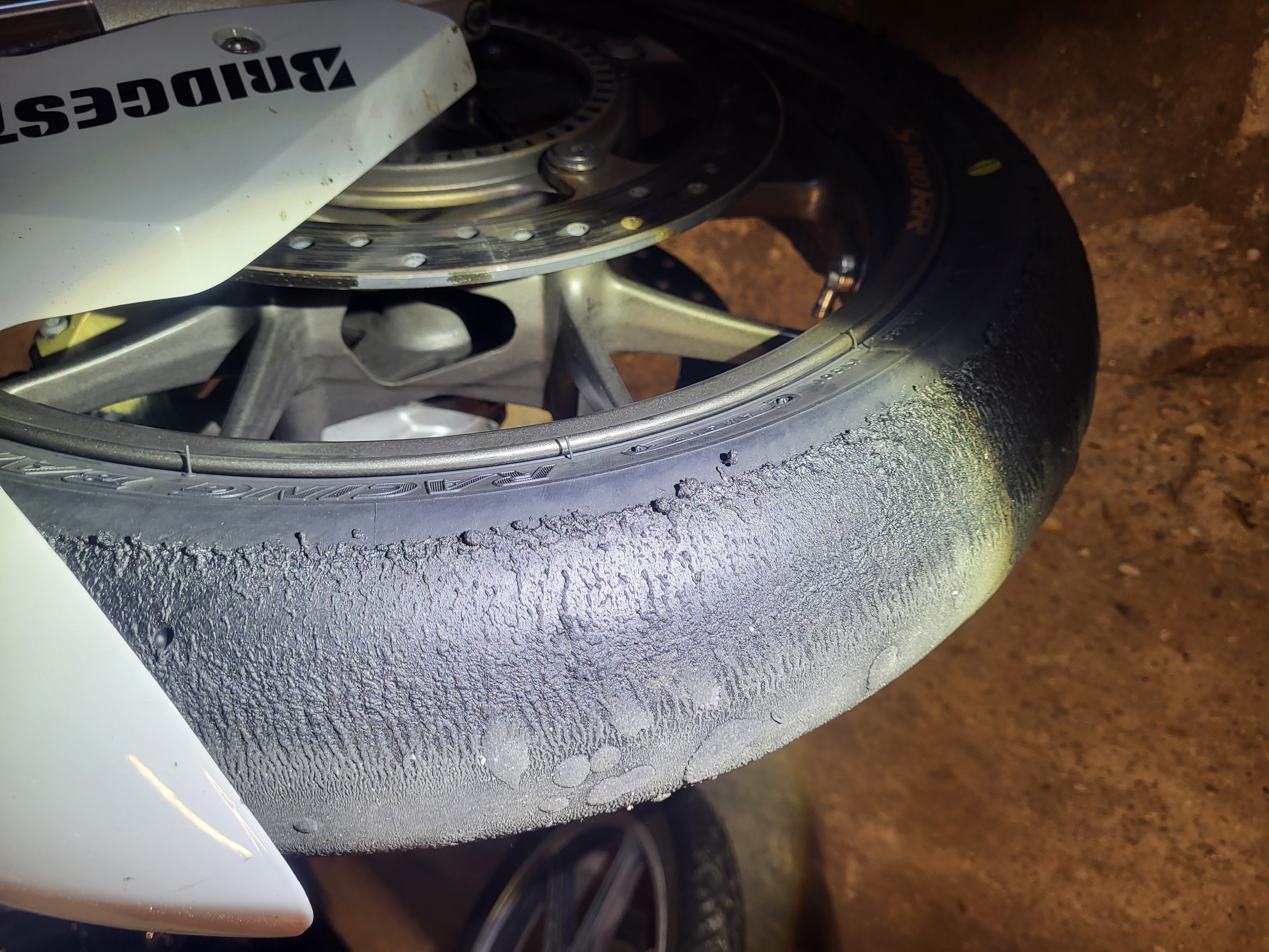 Im roten Kreis die "Flatschen" an Gummi sind nicht dein eigenes Gummi, sondern aufgesammelte Wutzen der anderen Kollegen. Die wurden warm genug, um auf deinem Reifen zu kleben, aber denen ist dann nicht mehr heiß genung geworden, dass die von allein durch Kurvenfahrt zur Flanke hin "weggeschoben" werden.