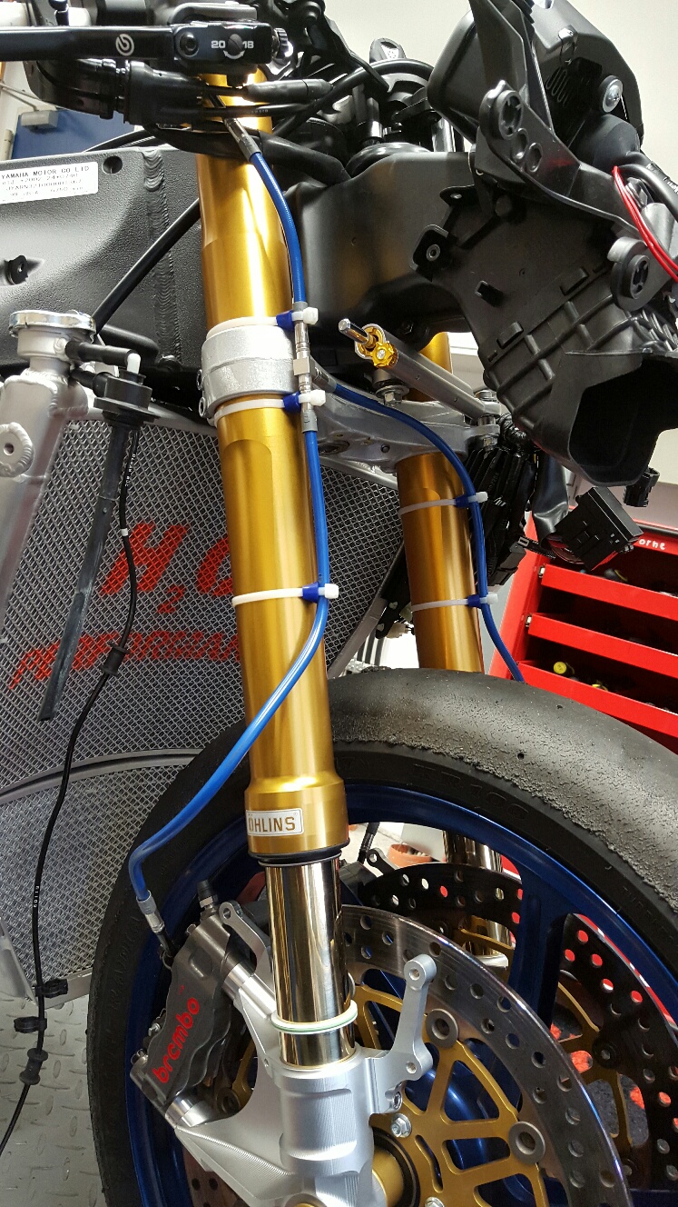 Eine Leitung von der Pumpe zur unteren Gabelbrücke, dann T-Stück und von dort