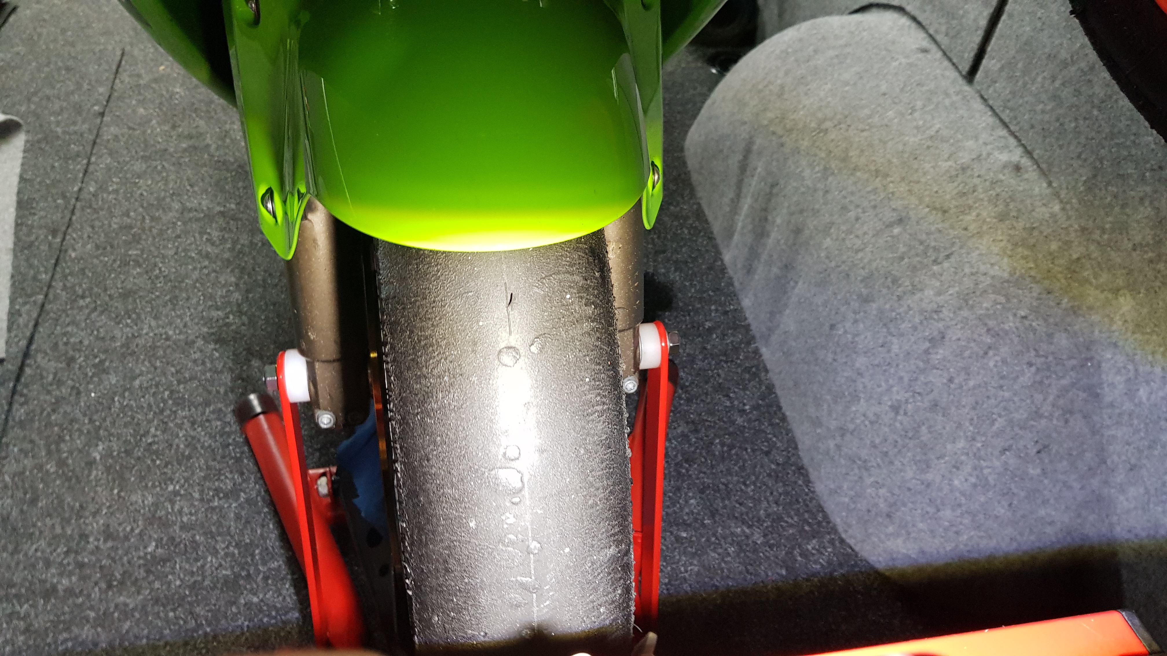 Ich habe an die Wippe 2 Flacheisen angeschweißt. Nachdem das Moped im Ständer steht, wird eine Gewindestange durch die Radachse gesteckt und verschraubt. Dann hinten noch ein Gurt über das Rad und fertig. Das Ganze geht ruck zuck und ist Bombenfest.