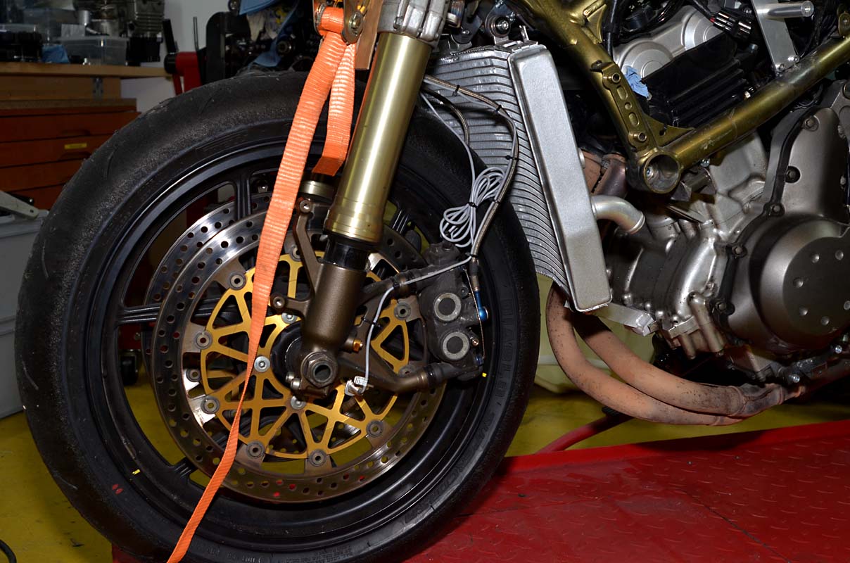 Viel Platz ist wirklich nicht. Ich habe da im Keller gerade mal eine Vollbremsung zum Probieren hingelegt. Hatte ich zur Probe mit einem ZX10R Kühler schon einmal gemacht, da war es wirklich knapp. Mit dem ZX6R Kühler in der aktuellen Einbauposition voll eingefedert ist noch etwas über 1 cm Luft. Falls erforderlich könnte der noch ca. 1cm nach oben und unten ca. 5 mm nach hinten. Ich denke aber, dass die 10er Gabel voll eingefedert nicht 1cm nach hinten geht.focuswrc hat geschrieben:Hast du Vorne mal eingefedert? Das sieht so Kühlervernichtend eng aus mit dem Vorderrad