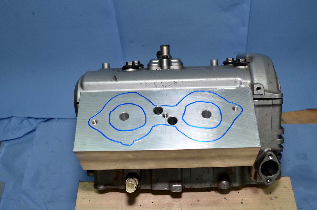 Der Adapter wird aus dem Vollen gefräst. Hier erkennt man bereits die 3 Gewindelöcher mit denen der Ansauggummi der ZX10R am Adapter befestigt wird. Die beiden größeren Löcher im Zentrum beherbergen die beiden 6er Inbusschrauben mit denen der Adapter zwischen den Zylindern am Kopf befestigt wird. Dann noch zwei 10mm Löcher quasi zum Anzeichnen des Zylinderabstandes. Blau habe ich euch mal die Umrisse der Ansauggummis der ZX10R angezeichnet.