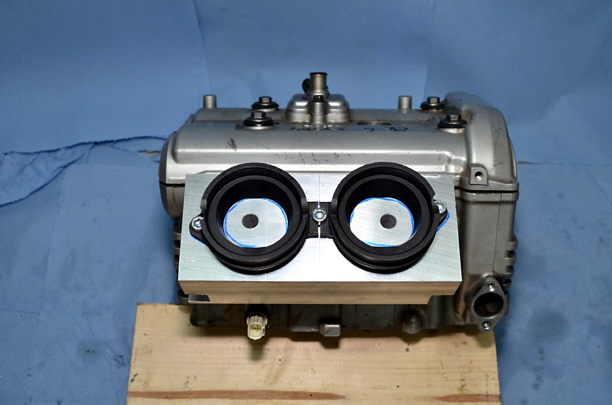 Nachdem ich einiges hin- und herüberlegt hatte, ist die Entscheidung für einen Adapter zwischen Zylinderkopf und neuer Einspritzanlage gefallen. Damit kann ich 1/2 Einspritzanlage incl. der Anschlüsse für die Gaszüge aus einer ZX10R verwenden.