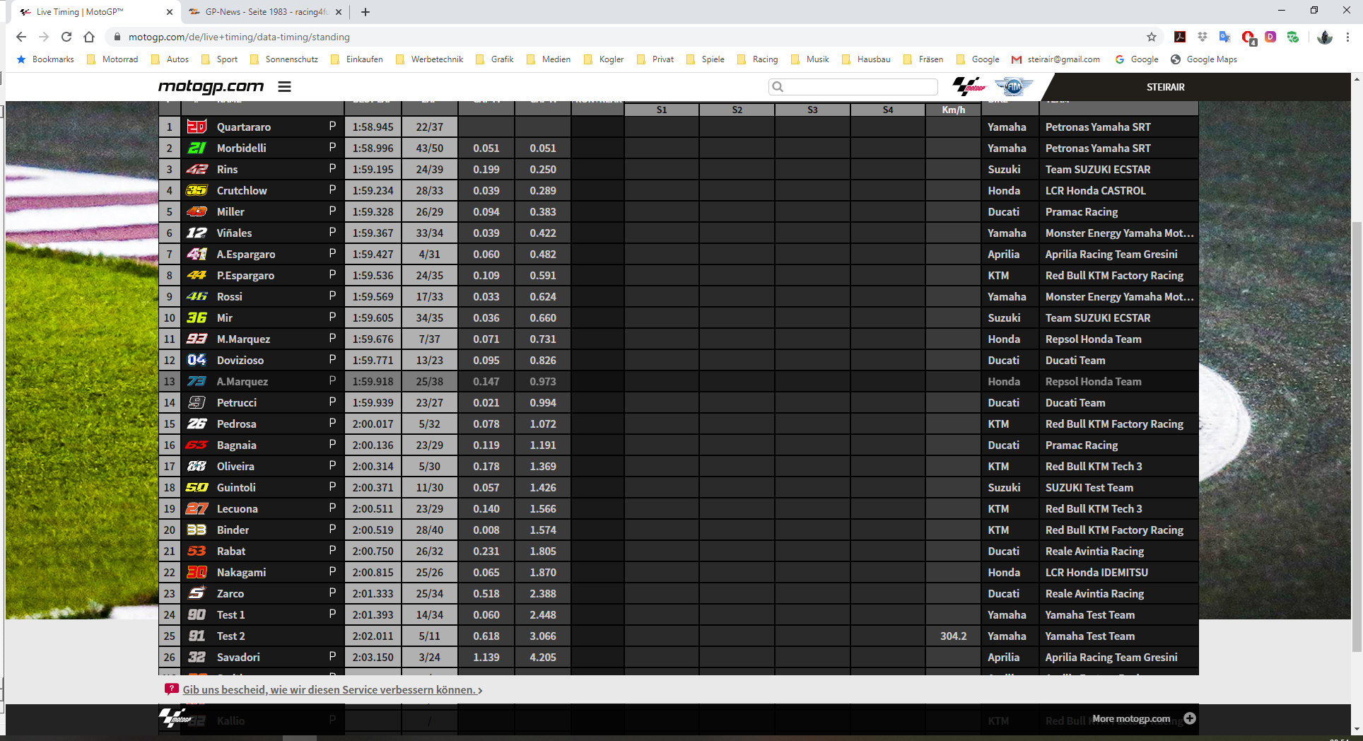 Güdy hat geschrieben:Strecke ist auf jeden Fall wieder trocken, Zarco hat eben persönliche Bestzeit gefahren und Quatarao fährt auch schon wieder locker unter 2 min.