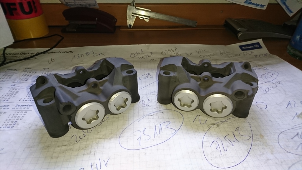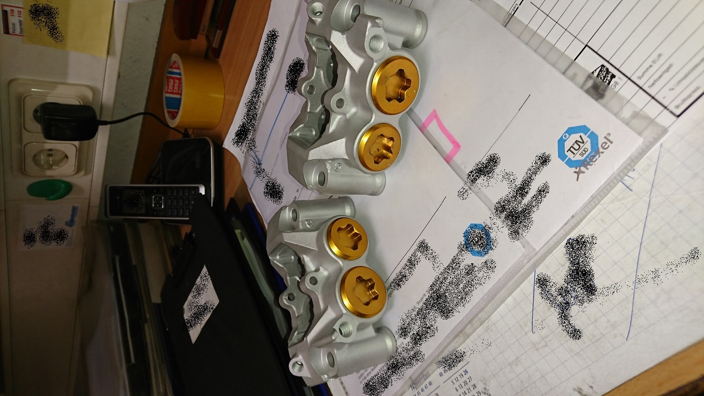 Sättel wudren zerlegt, enteloxiert, niederdruck Glasperlgestrahlt, werden jetzt neu eloxiert (Sättel Schwarz, Stopfen Natur),