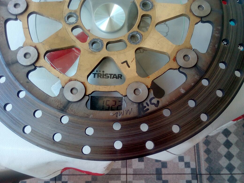 Was ich schon wusste, die Zentrierung der RSV4 Bremsscheiben haben 84mm, RS250 81mm. Hier musste also schonmal etwas Weg. Bei mir angekommen war dann auch klar das die Nabenbreite angepasst werden musste. Bevors ans abdrehen ging erstmal gekuckt ob genug "Fleisch" da ist, anschließend gings zu nem Kumpel.