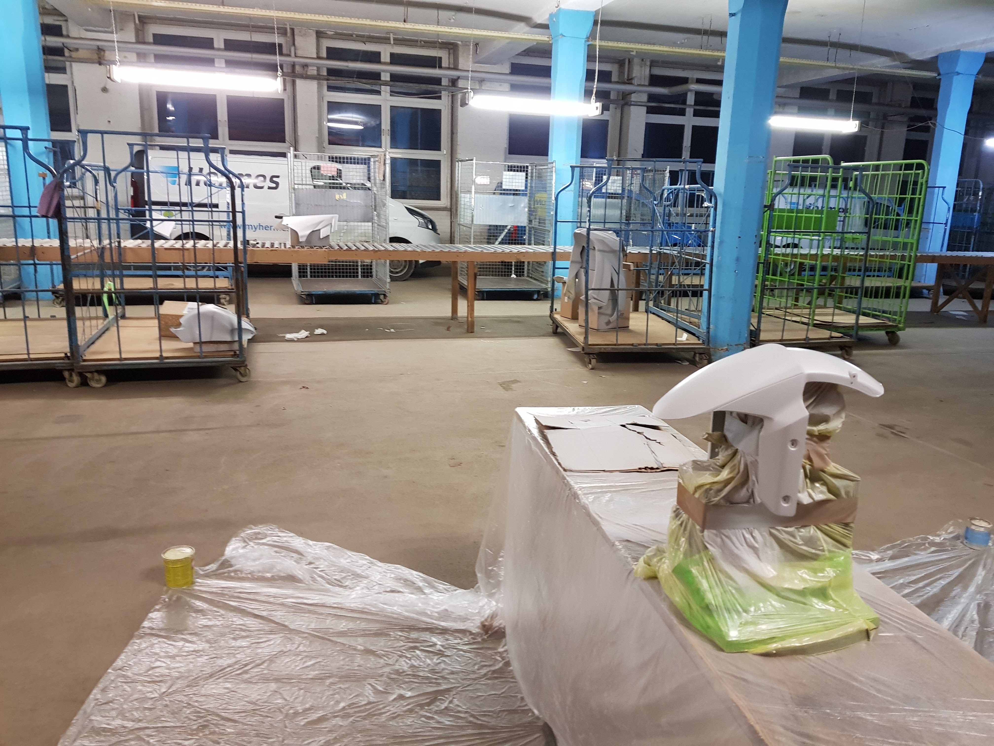 Mein Lackierplatz. Eine Halle, ca 17-18°C Temparatur. Leider viel Staub. Keine Absaugung , suboptimale Beleuchtung