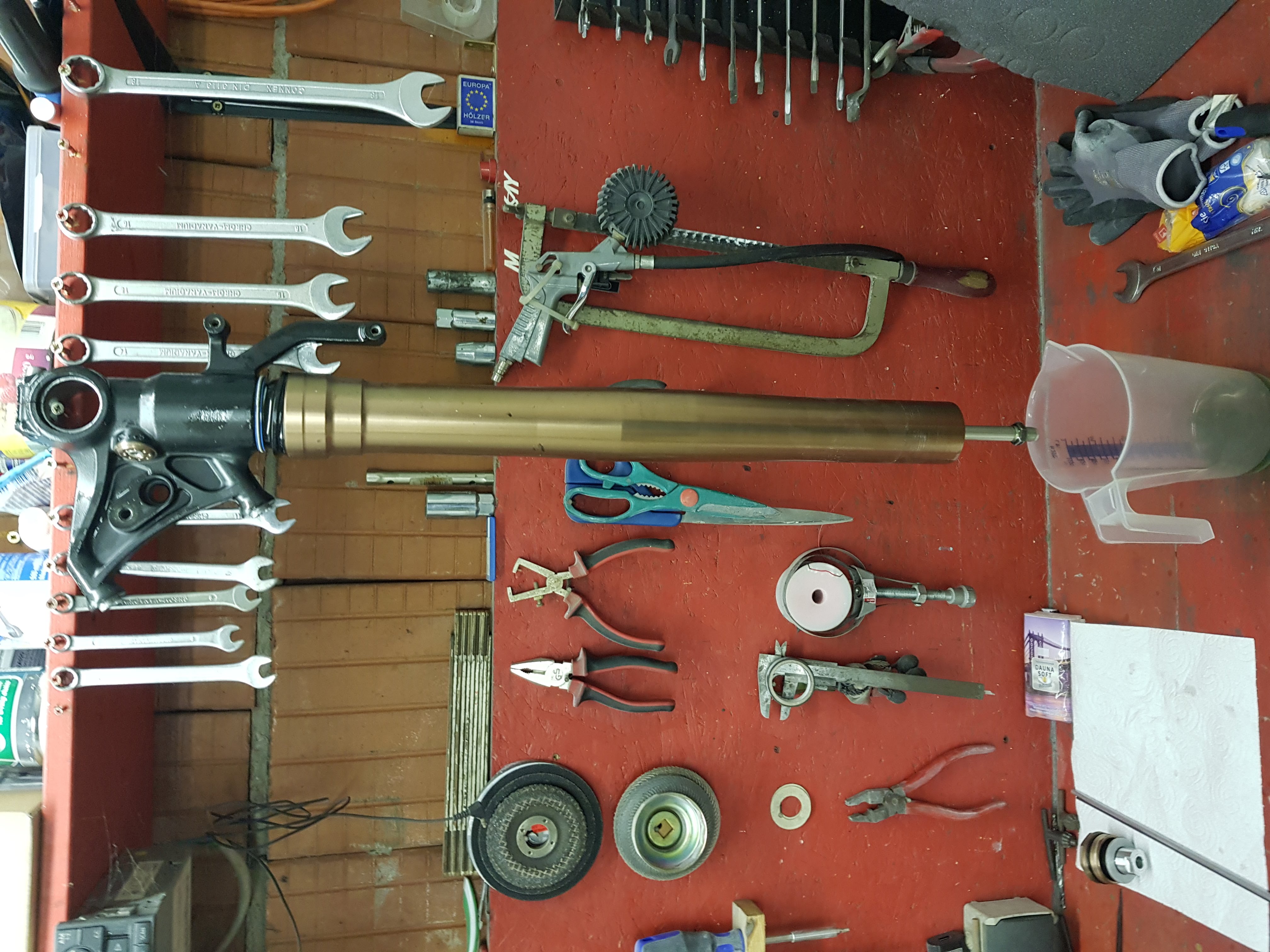 Danach werden Tauch und Standrohr getrennt. Ich habe dazu den Gabelfuß wieder eingespannt (diesmal waagerecht). Und dann am Tauchrohr mit Schwung gezogen- und siehe da: nichts passiert:-D Diesen Vorgang wiederholte ich viele viele male und wieder passierte nichts. Tauch und Standrohr waren nach wie vor miteinander verbunden. Der Verzweiflung nahe, völlig ratlos und mittlerweise ziemlich Pissed off. Brachte ich alle Kraft auf, nutzte den vollen weg der Gabel und es ging ab :-D