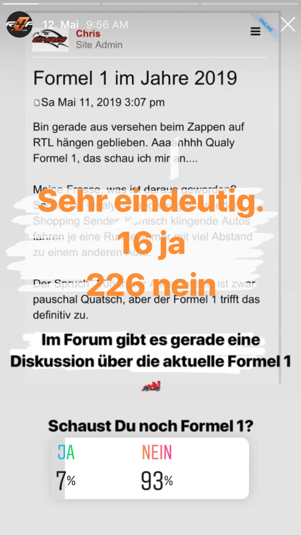 Ich habe eig. schon immer F1 geschaut, weil es meine Eltern gemacht haben. Aber es ist so öde geworden. Letztes Jahr war ich auf dem Hockenheimring und habe mir das Live angeschaut. Ich wollte es mir einmal sehen, hören und "spüren". Das war auch das letzte mal... Es ist so langweilig, der Sound ist langweilig, alles ist langweilig. Drumherum wird viel geboten aber das wars dann auch.