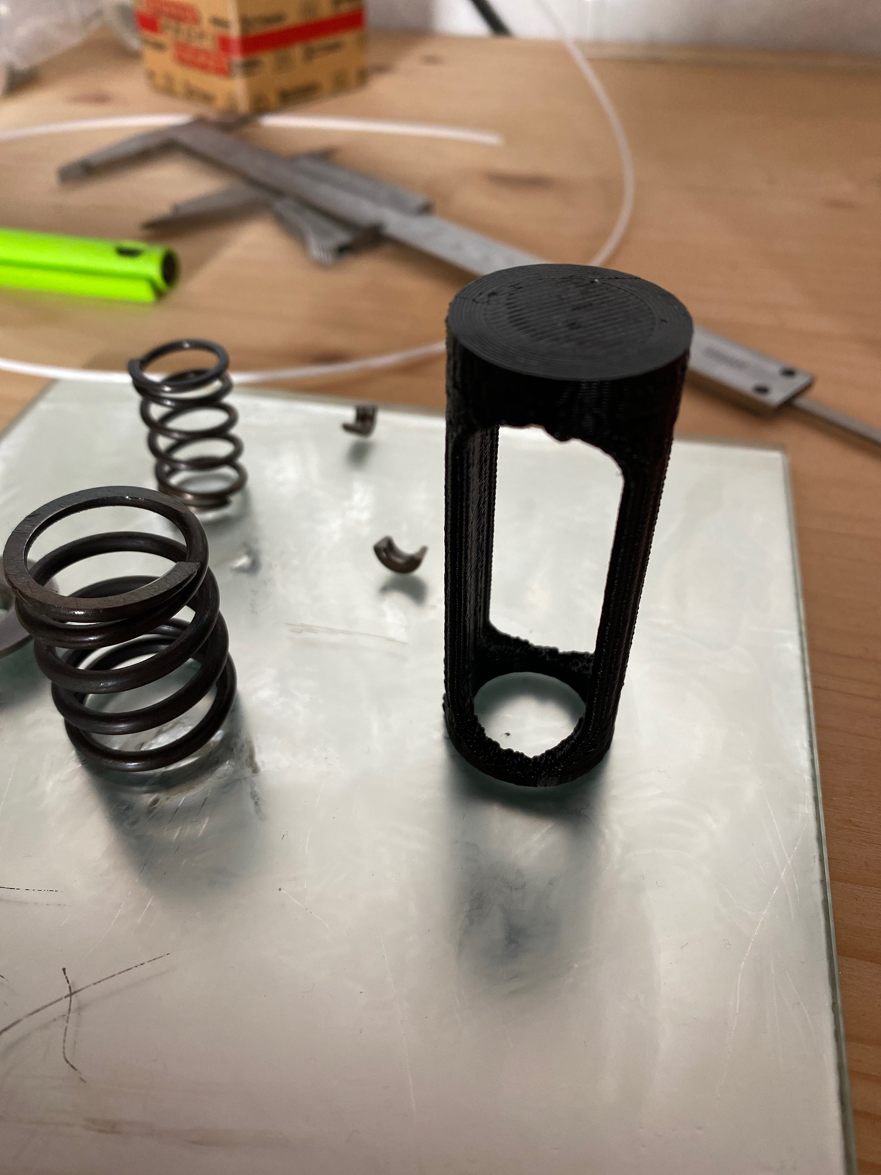 Die Ventile auszubauen ist übrigens sehr einfach. Die wieder einzubauen nicht... Ich habe mir dann in ranzigster Auflösung so ein Rohr mit Fenster gedruckt und an die abgefuckteste Schraubzwinge geklebt. Das hat prinzipiel schon einmal sehr gut geklappt. Jetzt nurnoch die Keile da rein fummeln :roll: :lol: