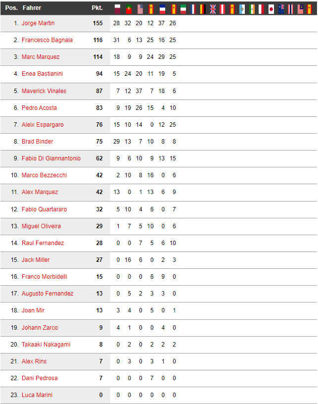 Er hatte gestern ja in einem Interview mit Pol Esparago (zu sehen auf seinem Instagram Account) gesagt, dass er nach dem letzten Jahr nun physisch bei 100% ist, dass die Ducati ihm das Leben einfach macht und man das auch in den Rennen sieht. Die Leistungen aus den letzten beiden Rennen würde ich als außergewöhnlich und nicht zufällig bewerten. Sofern er von weiter vorne startet werden die Kontrahenten vermutlich nicht so gut wegkommen. Vielleicht sehen wir nach Pecco gestern in zwei Wochen in Mugello ja einen Spanier ganz oben auf auf dem Treppchen.Boo hat geschrieben: ↑Montag 27. Mai 2024, 10:13 Das denke ich auch. An den letzten 3 Rennwochenenden hat MM die meisten Punkte gesammelt, der sieht und hat definitiv Chancen auf den Titel.