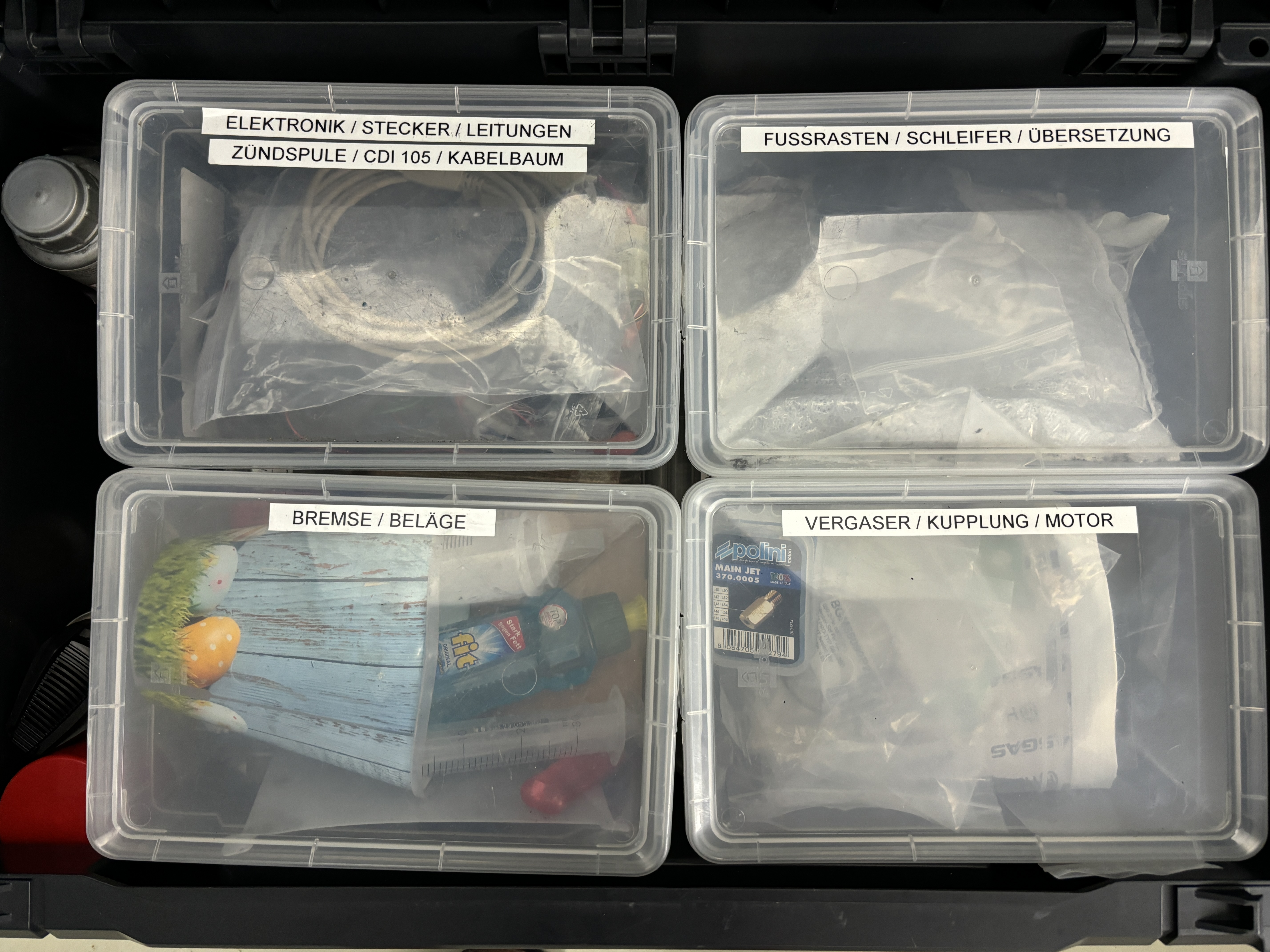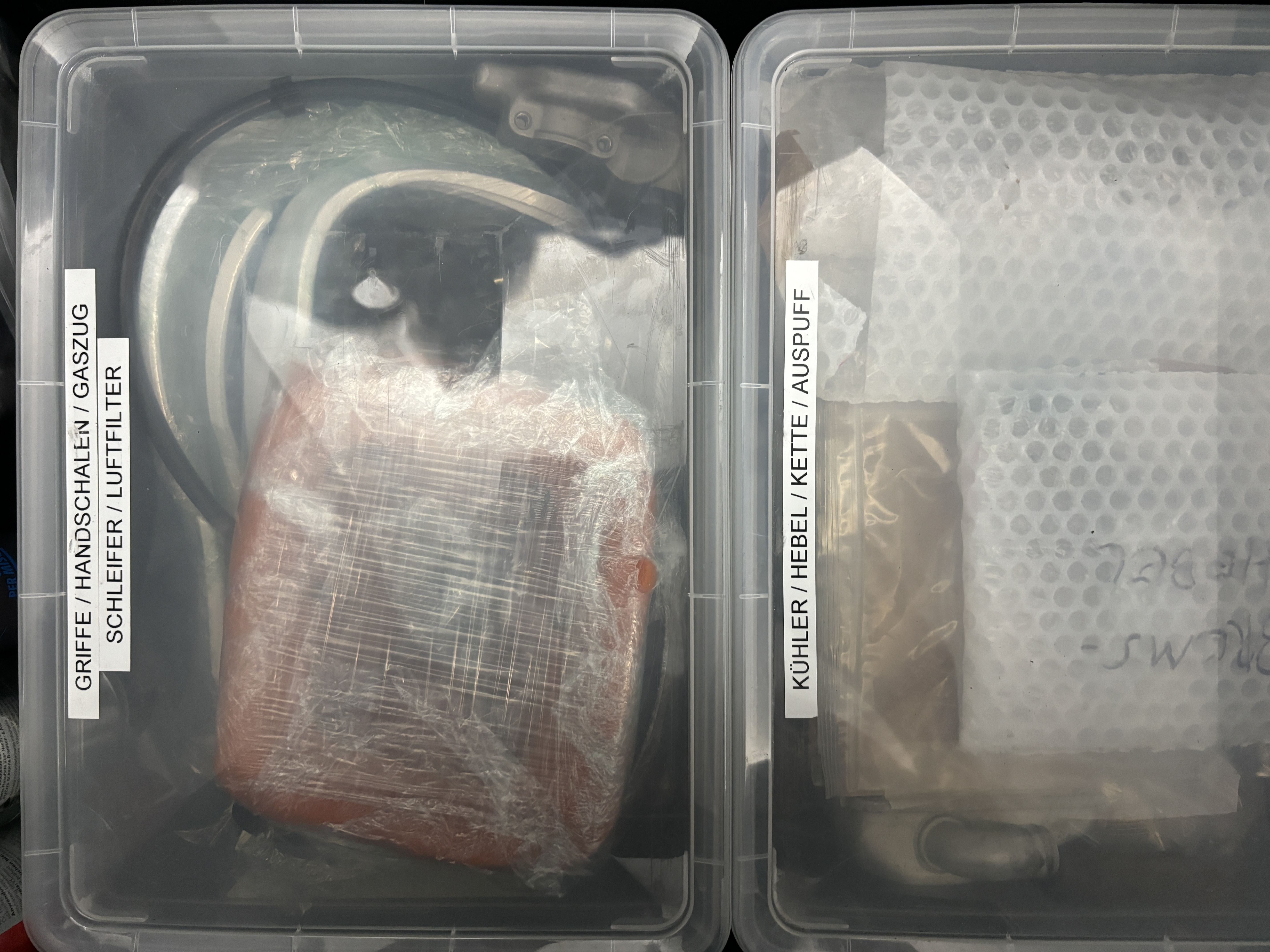 Beim Pitbike habe ich den Fokus eher auf Sturzteile. Einen Ausfall in der Meisterschaft kann ich mir nicht erlauben und Ziel ist es die Maschinen im Falle eines Sturzes so schnell es irgendwie geht wieder fahrbereit zu machen. Daher habe ich alle Teile in entsprechenden Kisten nach Baugruppe / Bereich vorgepackt.