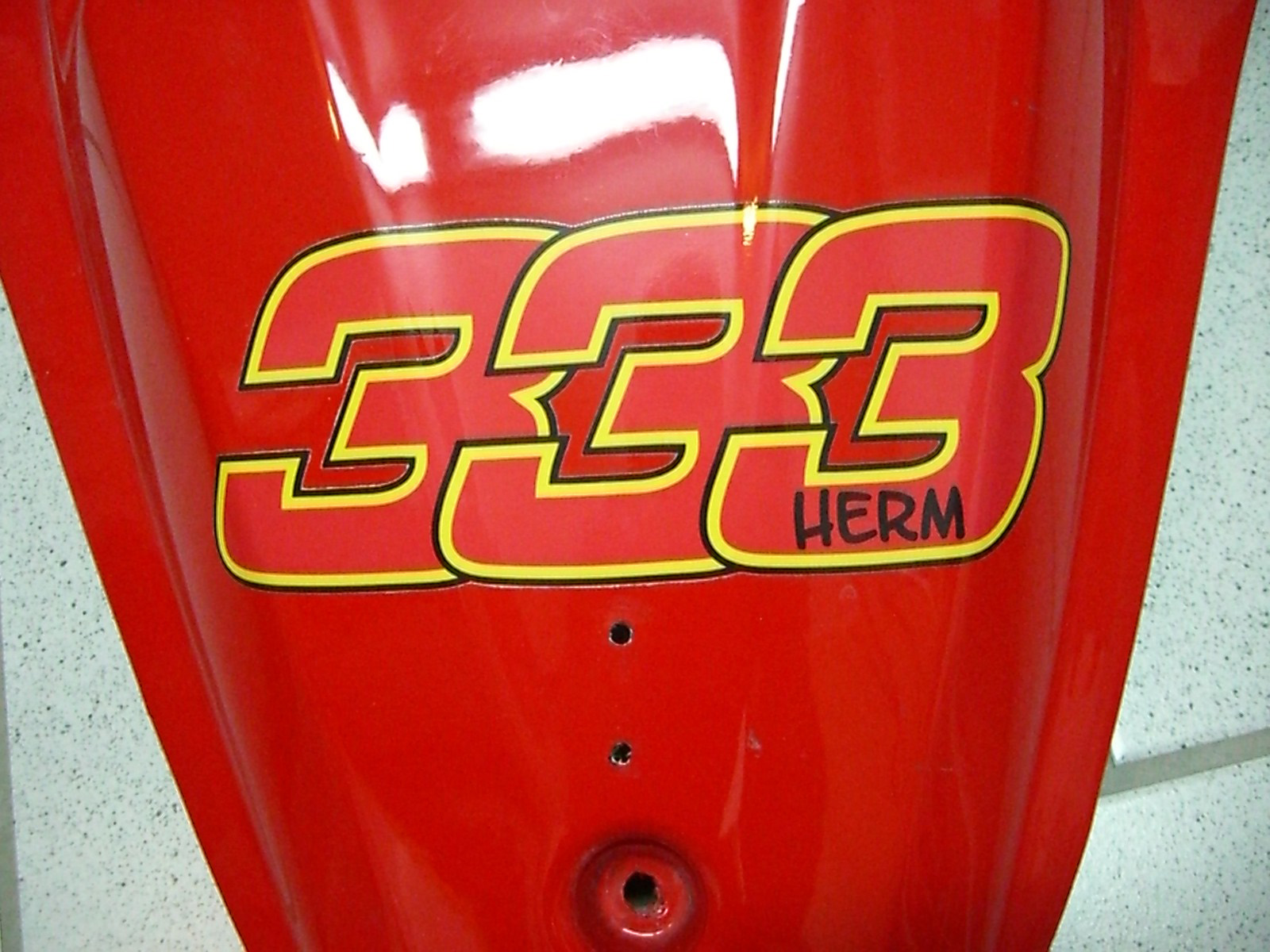 ich brauche die Startnummer 338 im Design wie die 333 auf dem Foto, incl. "Herm"-Schriftzug in der letzten Nummer. Höhe ca. 8cm, Breite ca. 20cm. Das Design kommt von Melandri, als er noch eine Honda in der MotoGp fuhr. Ist das machbar?