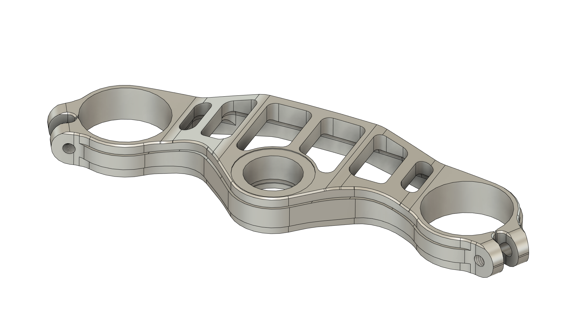 Zudem sieht man dort gut eines der fertigungstechnischen Problem von solchen Stellen. In dem Fall natürlich auch dem händischen Fräsen und der damit wesentlich geringeren Positions und Wiederholgenauigkeit geschuldet, aber auch auf meiner CNC-Fräser wären solche Kontaktmarken dort wo die Taschenwand und die tangentialen Berührungspunkte mit den Durchbrüchen liegen nicht vermeidbar. Zumal zwischendrinn auchnoch ein Werkzeugwechsel sattfinden muss von einem Ballnose-Fräser zu einem der in der Lage ist in voller Tiefe die Durchbrüche zu fräsen. Da die äußeren Durchbrüche nur 10mm breit sind, müsste ich entweder den Radius auf der Unterseite der Stege verkleinern, was eine stärkere Stresskonzentration bewirken würde, den größen Radius abzeilen, das treibt dann aber nicht nur die Bearbeitungszeit in die Höhe, sondern führt auchnoch zu schlechteren Oberflächen, oder ich müsste die Durchbrüche vergrößern um mit dem Radienfräser auch gleich diese zu fräsen. Aufgrund der FEM-Analyse weiß ich jedoch, dass die äußersten Stege eine der am stärksten belasteten Stellen sind und diese Belastung steigt enorm mit der Breite des äußeren Durchbruchs an.
