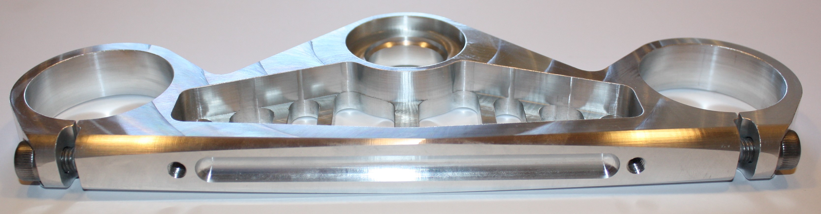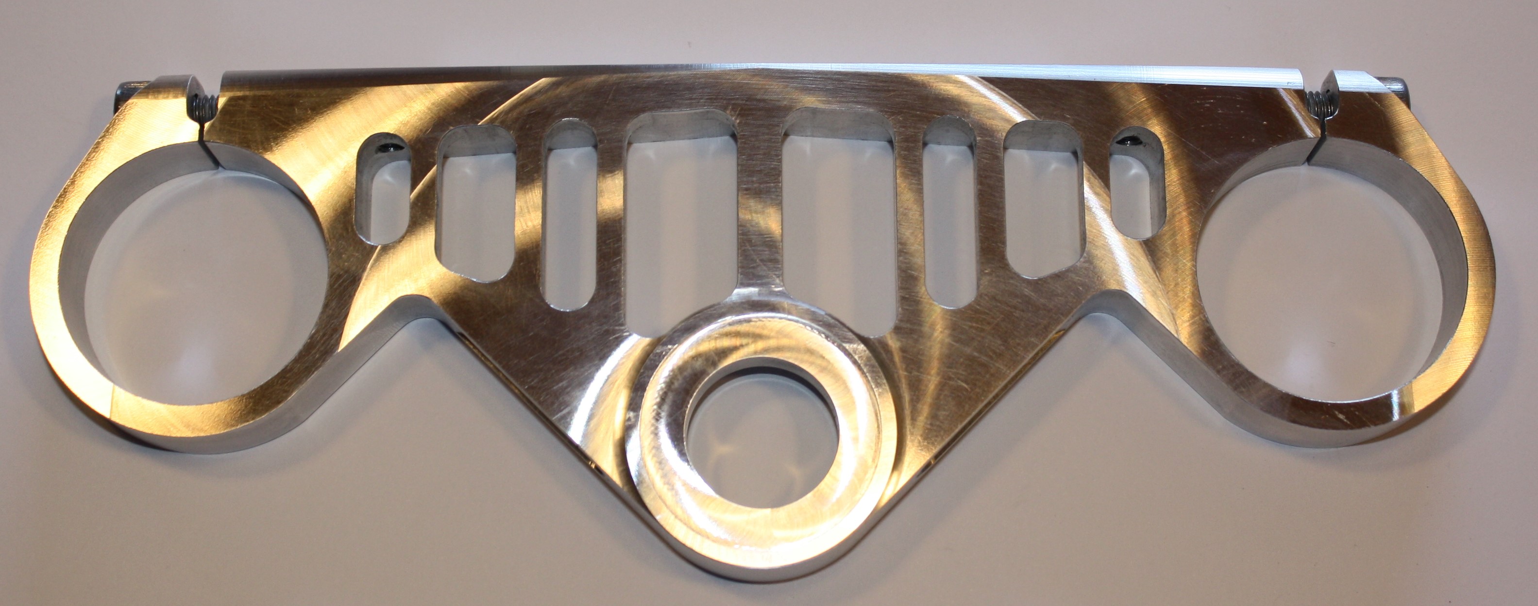 Auch werden die Oberflächen so einfach besser, als wenn ich in voller Gabelbrückenstärke mit einem verhältnismäßig dünnen 6mm Fräser zustellen müsste. Etwa 4xD bei einigen Brücken.