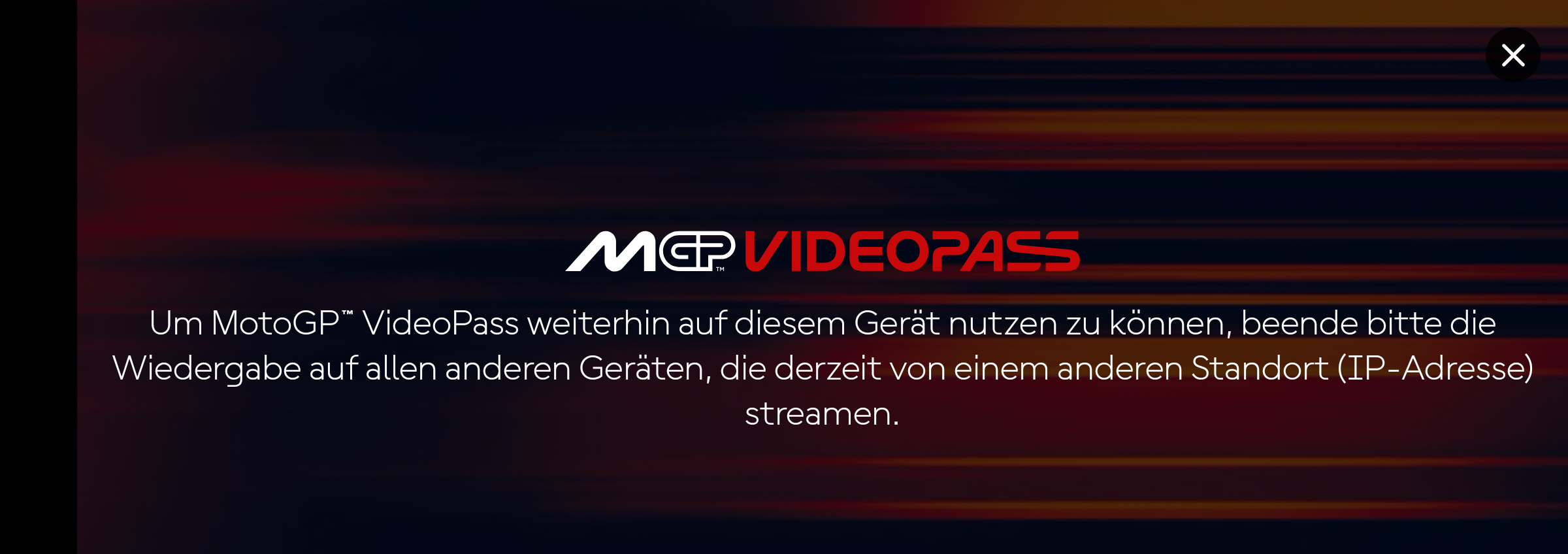 Am Handy kam in der MotoGp App dann immer nach 2 Minuten die oben genannte Meldung. Erst nachdem ich mich am PC (auf der MotoGp Seite) nochmal an und wieder abgemeldet hatte war es weg.