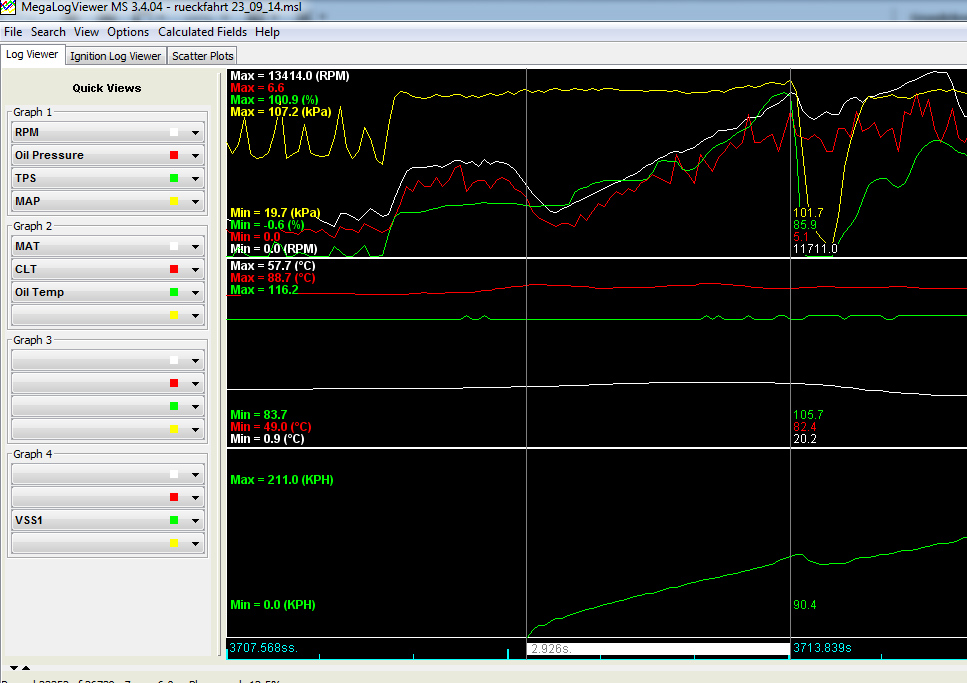 Öldruck & Temperatur sowie die anderen Temperaturen sind aber schon richtig eingestellt. Die 130° wurden nicht erreicht, das habe ich manuell so eingstellt, zwecks gleicher Skalierung von Öl und Kühlwasser.