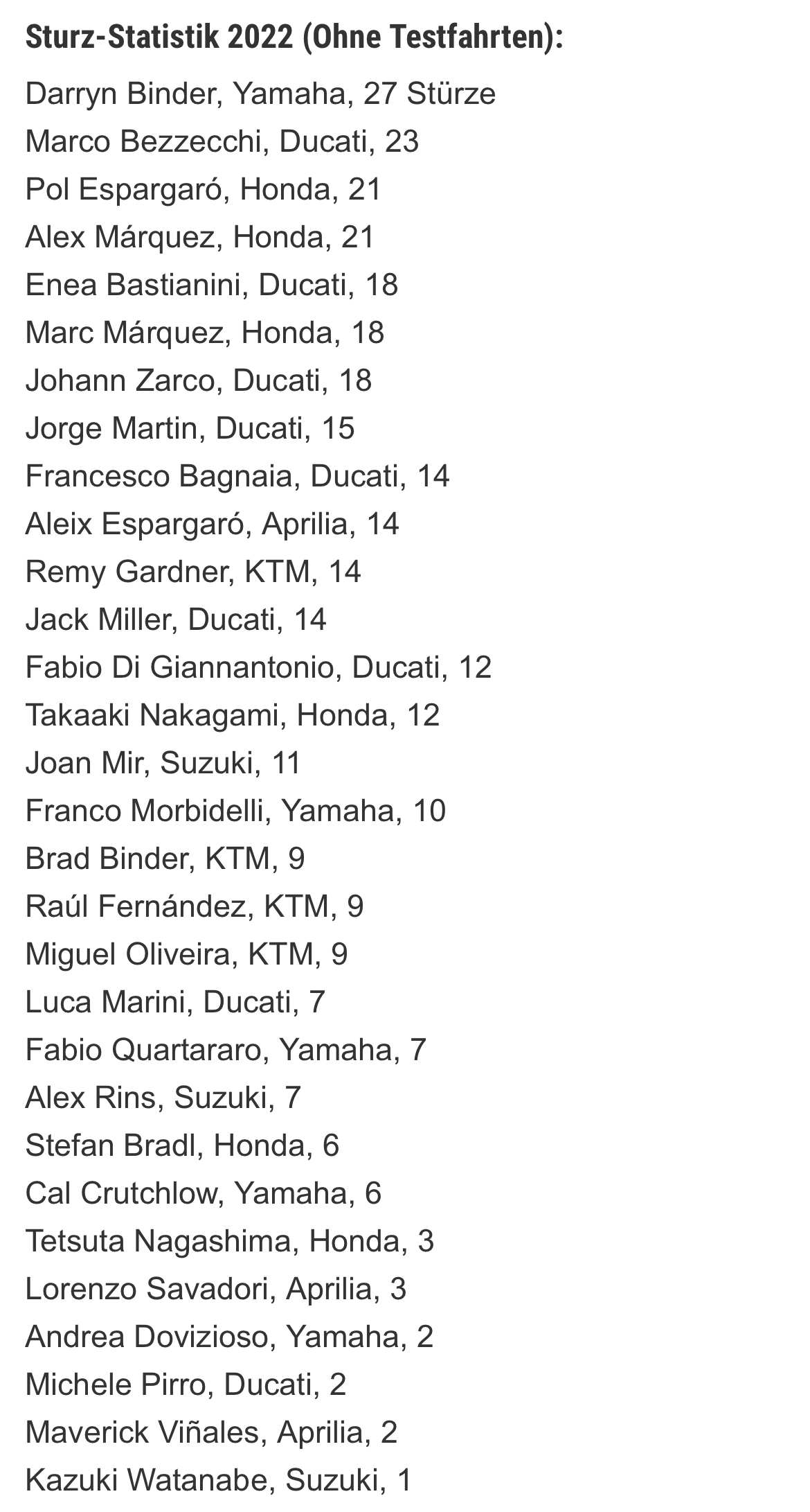 335 Stürze in der Saison 2022. das sind mehr als 16 Stürze pro WE.