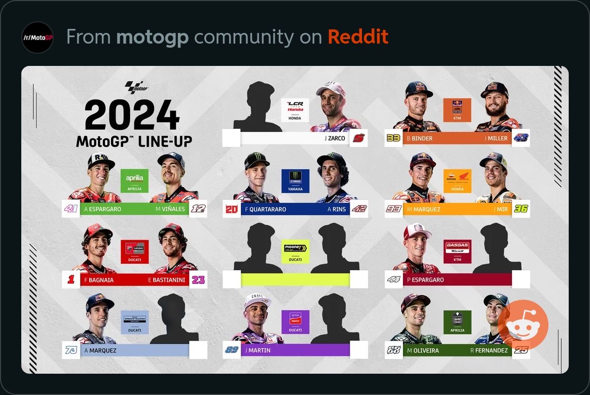 Ist MV Agusta nun nicht auch Teil der KTM Familie?J-C hat geschrieben:Natürlich hat der nen Vertrag. Aber meiner Info nach sind die Pramac-Fahrer alle bei Ducati angestellt, also sollte es auch möglich sein einen Fahrer mit Vertrag dort fahren zu lassen. Offiziell mit dem Argument „…mit weniger Druck wie im Werksteam…“Kurvenjunkie hat geschrieben:Den Gedanken hatte ich auch schon. Klar war er von Verletzungspech geplagt aber für Pecco war er noch nicht ein einziges Mal eine Hilfe im Rennen. Nur hat er einen gültigen Vertrag wobei der sicher auch gekündigt werden kann.