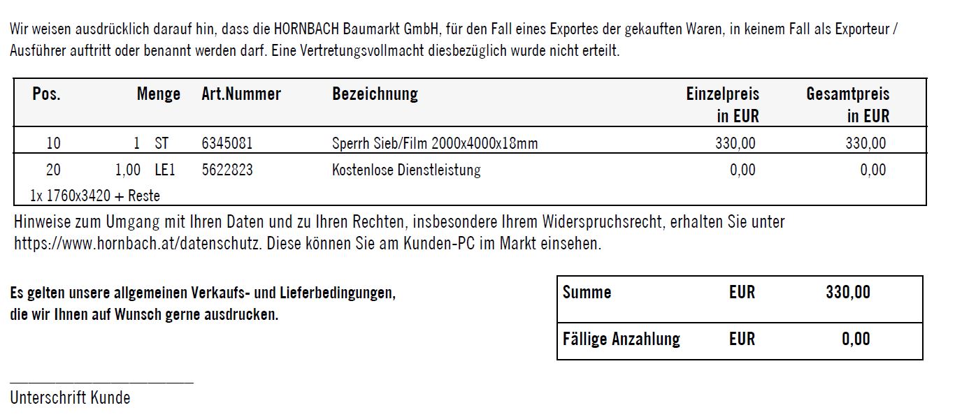 Preise muss man natürlich immer vergleichen. Bei mir hat es sich anders herum ergeben.Petz von Fetz hat geschrieben:Habe alles abgekplappert an Holzfachhandel (inklusive Beziehungen über Tischler) und überraschenderweise war dann HORNBACH mit kostenlosem Zuschnitt der 4000 X 2000 X 18mm Platte auf 3420 X 1760 um 330,- EURO der allergünstigste Anbieter.fredo hat geschrieben:Der örtliche Holzgroßhandel hilft dir gerne bei der Beschaffung einer großen Siebdruckplatte.