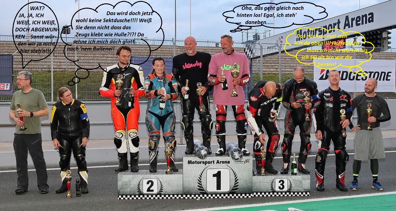 Rolf ließ sich durch die herunterfallende Feuchtigkeit nicht die gute Laune vermiesen, betonte aber immer wieder, dass er im Regen nicht fahren würde. Während Oschersleben vorgab, Assen zu sein, schauten wir beide immer wieder auf den Zeitplan, die Strecke, den Asphalt vor unserer Nase und nach oben.