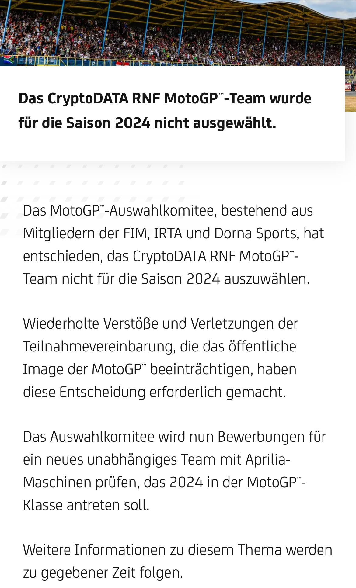 So steht es auf der MotoGP Seite.Chris hat geschrieben:Hä? Wieso? Da hört doch nur der Chef auf dachte ich?TTs Target hat geschrieben:Dafür verliert RNF seine Plätze, mal schauen was da nun noch kommt