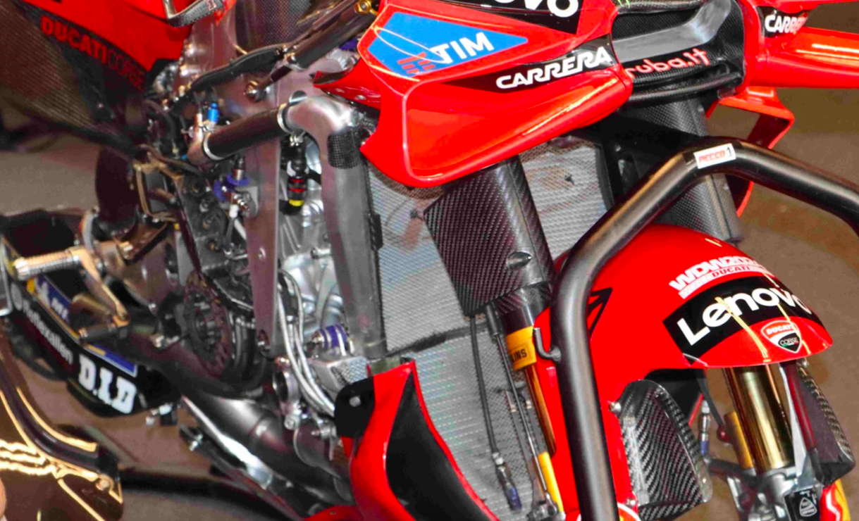 Man beachte das dünne Blech zur Motorhalterung an der GP24. Hier wird auf mehr Rahmenflex gesetzt, um die Ducati einfacher um die Kurve zu bekommen!