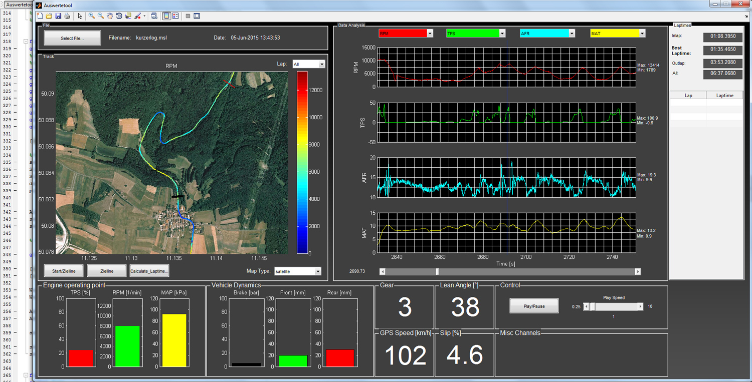 In der Darstellung sind noch ein paar Platzhalter dabei, weil die Daten noch nicht mitgeloggt wurden. (Slip, Lean Angle, Brake Pressure, Front and Rear Suspension Travel ...)