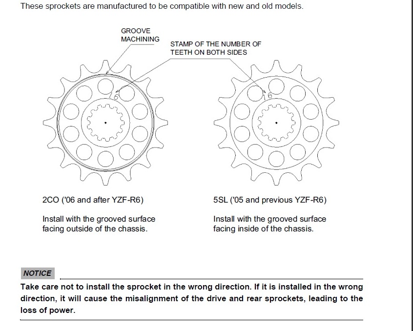 Es gibt verschiedene Ritzel für die R6 Modelle. Die einen sind für die Serienmutter mit der dicken Unterlegscheibe gedacht, die anderen sind KIT- bzw. Rennsportritzel in 520er Teilung, so wie das auf deinem Foto. Anstelle der Serienmutter muss man die eine andere Mutter mit einer entsprechenden Unterlegscheibe (dünn & gezahnt) verwenden, sonst funktioniert das leider nicht. Die Bestellnummern findest Du im Anhang.