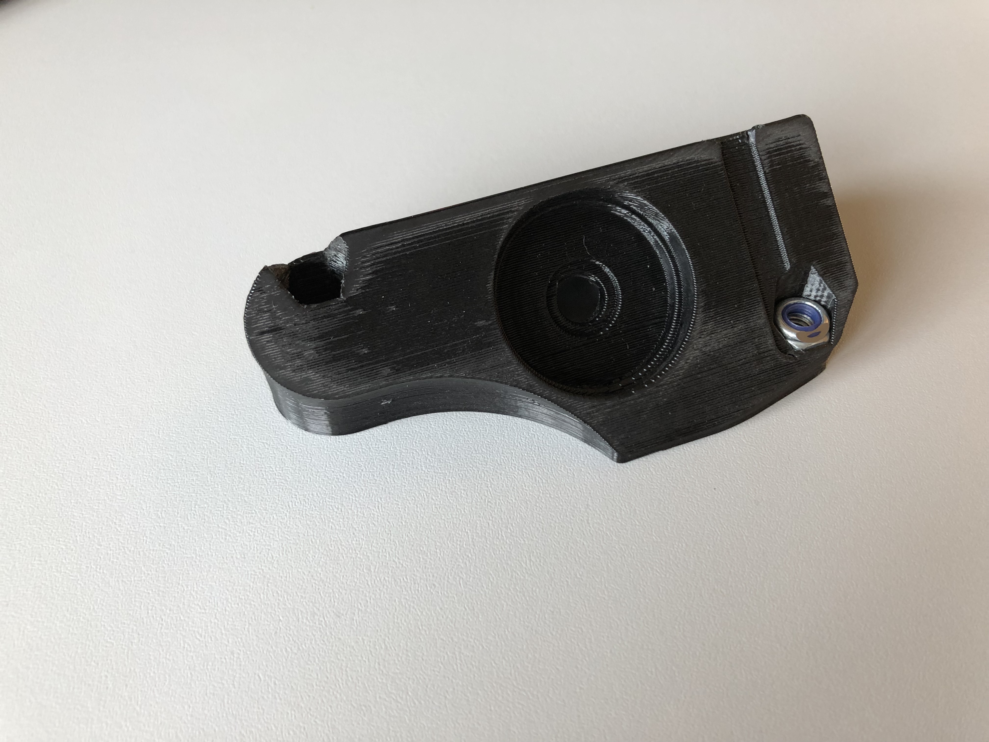 Gestalte den Halter doch bitte so, dass du die beigelegte Schraube mit den beiden Gummischeiben (im Lieferumfang) so im Halter platzieren kannst wie in der deutschen Anleitung auf Seite 6 gezeigt. Dabei bitte die 12,5 mm Bohrung im Halter beachten, so das die Kragen der Gummischeiben in den Halter ragen können (müssen!).