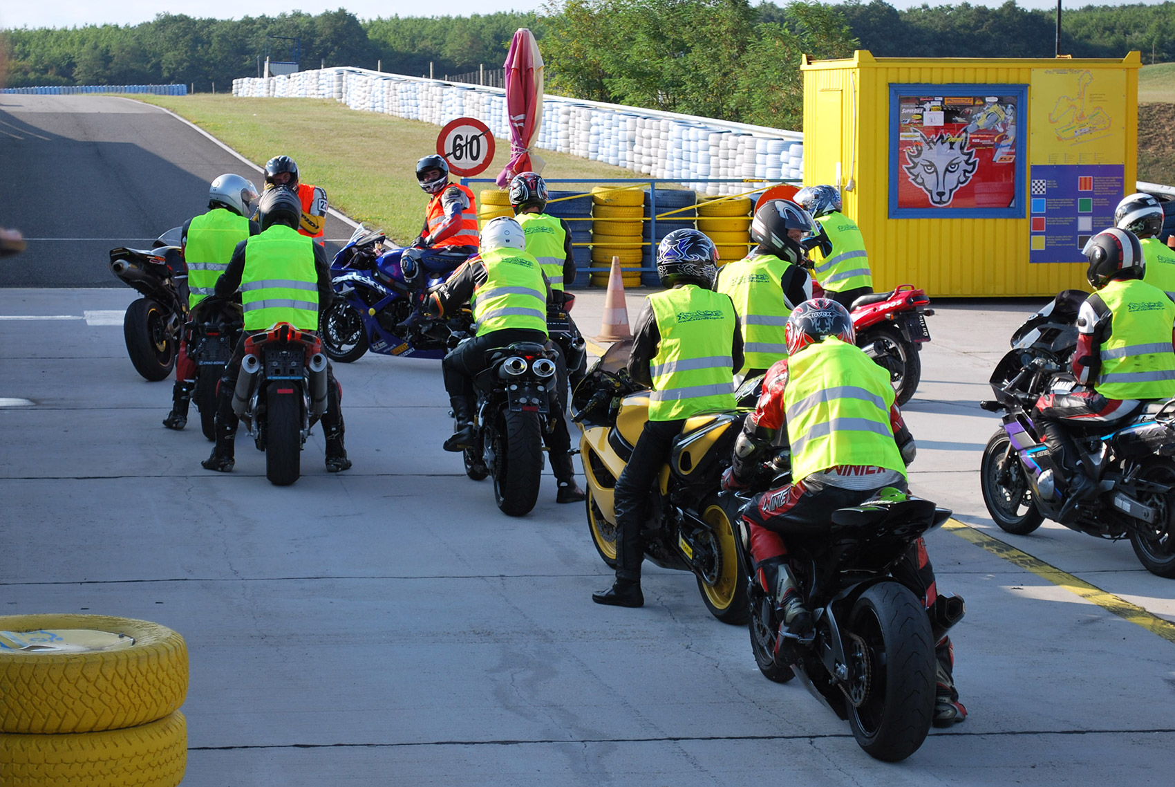 Für den ersten Turn behielt ich die Pirellis noch drauf. Zum Einrollen taugen die noch. Gruppe weiß war an der Reihe, aber es war unruhig geworden im Fahrerlager. Gerüchten Zufolge ist die Strecke rutschig. Das Schimpfen der Teilnehmer über die Bedingungen ging wie ein Lauffeuer die Reihen. Eine Woche zuvor gastierte hier die Formel 1 und die hat die Strecke gründlich versaut. Flox und ich rollten also zur Ausfahrt, Wolfgang von Speer Racing stand schon mit einem Streckenplan bereit und erklärte jedem genau, dass in der Doppelrechts schwierige Verhältnisse herrschten. Die Strecke sei angeblich sehr sandig und rutschig. Los geht’s. Raus aus der Boxengasse direkt auf Kurve 2 zu, umlegen, nach links auf Kurve 3 und schön rausfeuern. Anbremsen der Spitzkehre, Umlegen und zack Richtung Mercedes Arena. Wobei mein Zack eher ein Zaaaaaaaack ist. Die Beschleunigungsschwäche meiner 10er kam hier voll raus. Dann rechts, links und wieder rechts ab zum Motodrom. Einfahrt erwischt, hmmm bisher alles normal. Dann rein in diese wunderschöne überhöhte Sachskurve und jetzt aufpassen. Über den Hügel, die erste Rechts etwas anbremsen und huiiiiiiiii, Alter! Grip nicht vorhanden. Ich rutschte einfach weiter. Krass. Irgendwie schaffte ich es mit Bibbern und Beten rum. Das war mein erstes Rutschen über beide Räder über diese Distanz. Hat sich fast wie Aquaplaning angefühlt. Vorsichtig weiter zu Kurve 13 Richtung Start / Ziel. Ebenso: Grip gleich null. Das Herz pocht schnell, aber irgendwie wars auch geil. Nun, in den nächsten Runden ging es genauso weiter. Die Fahrer brachen reihenweise ab oder fuhren so aufrecht wie möglich hindurch. So ist das echt schwierig, ja fast unmöglich. Ich beendete diesen Turn auch frühzeitig. Das war mir zu heiß.