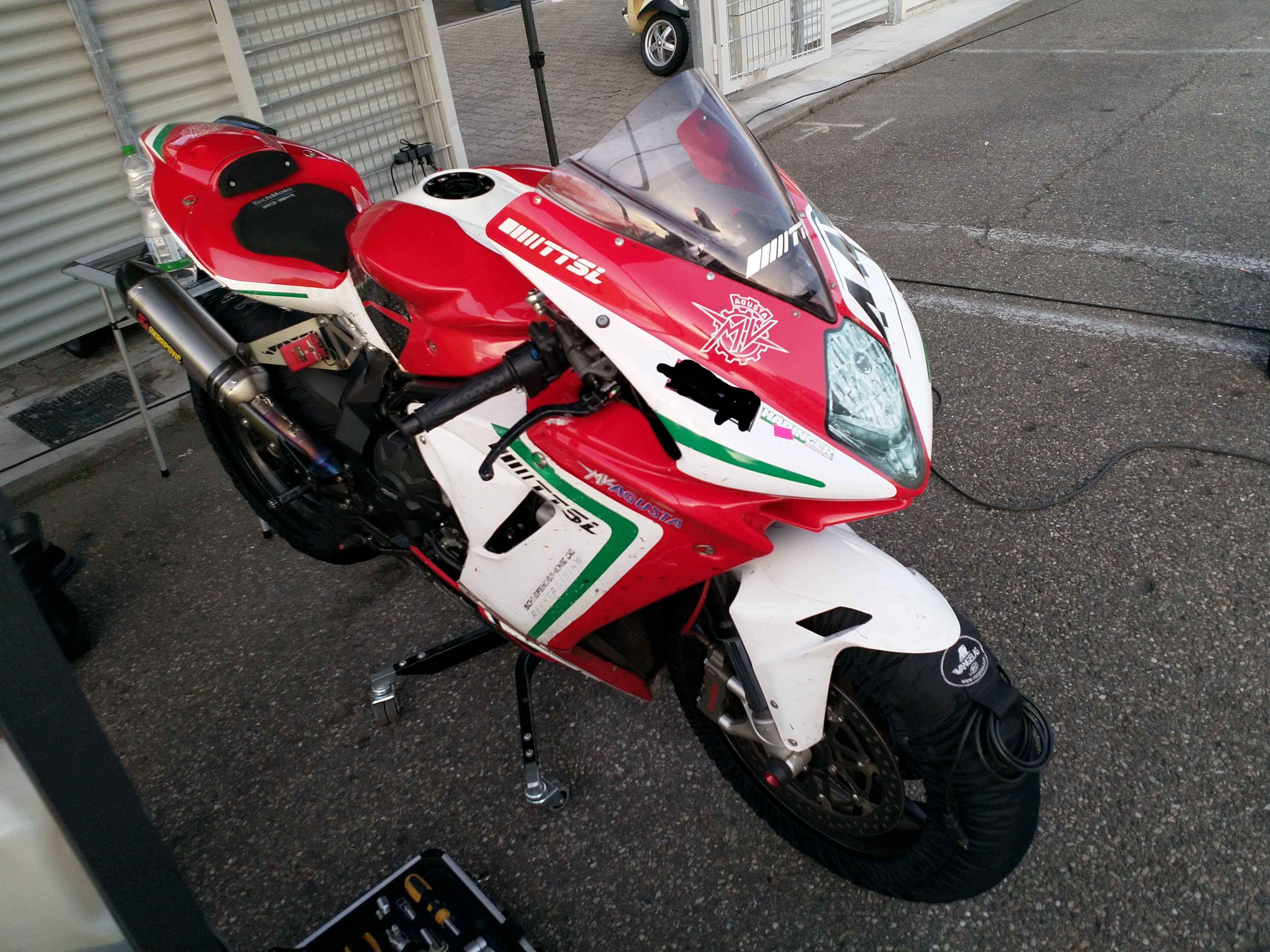 Direkt hinter uns hatte Flox bereits sein Zelt aufgeschlagen und den Pavillion festgemacht. Darunter stand eine wunderschöne umgebaute MV Agusta F3 mit so ziemlich allem was das Racerherz begehrt. Er schlief tatsächlich draußen im Zelt, obwohl er auch die Transporteroption gehabt hätte. Klarer Vorteil im Sommer. Den Sternenhimmel konnte ihm so keiner nehmen.