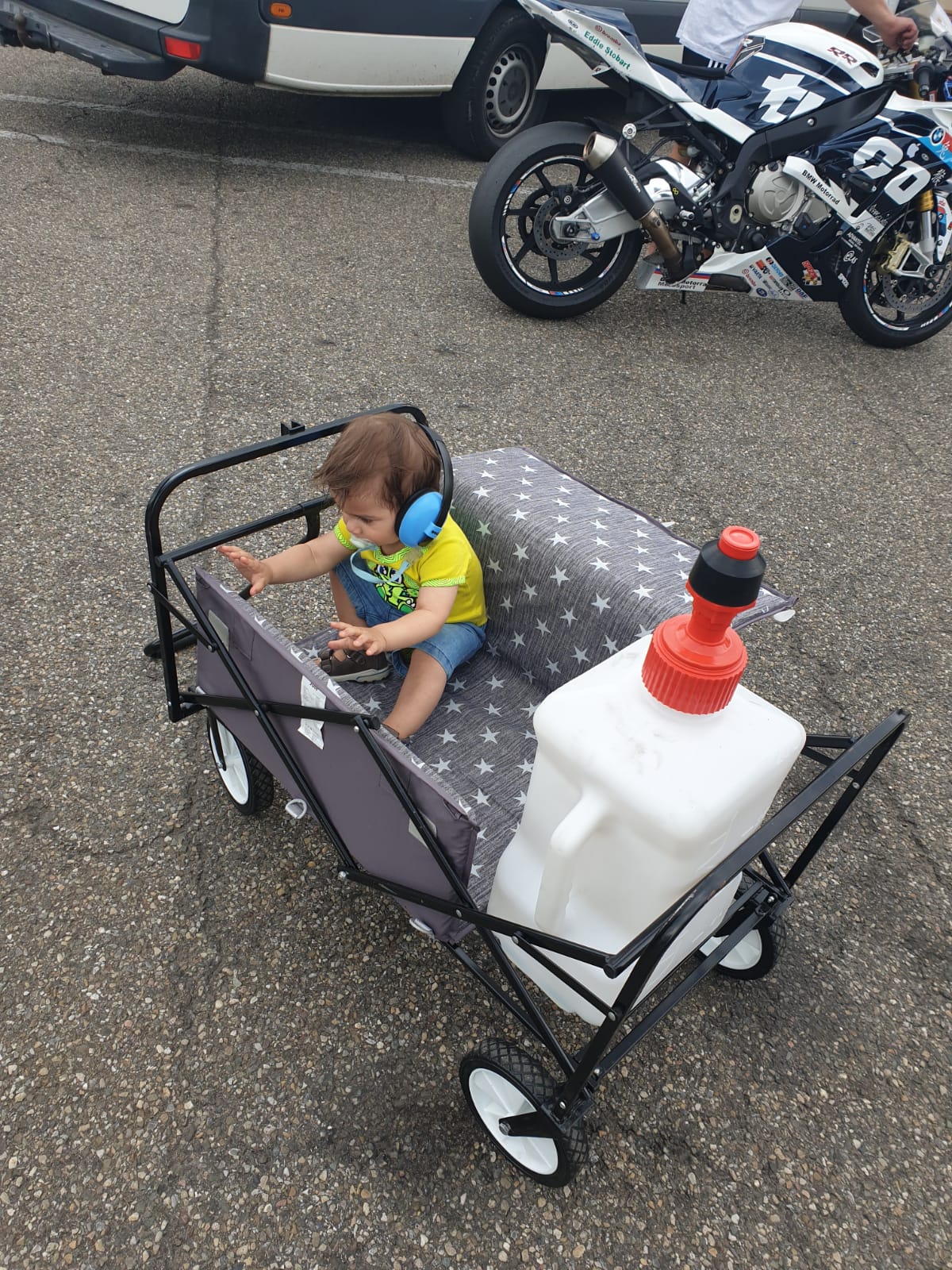 Im Lauf des Tages lernten wir auch unsere Nachbarn kennen, beides echt nette Typen, jedoch auch alleine am Start. Beide unterwegs auf dem Rennstreckenklassiker BMW S1000 RR. Jeweils unterschiedlich aufgebaut. Naja, passten wir halt aufeinander auf und quatschten zwischendurch ein wenig. Mit Kind hast ja immer gleich ein Gespräch. Besonders wenn der so aktiv dabei ist. Klaro machte Jonas unter Beaufsichtigung auch das Fahrerlager, sowie die umliegenden Motorräder unsicher, musste er doch auf jedem sitzen und die Konfiguration prüfen. Haben die Besitzer die Hobel auch korrekt zusammengeschraubt? Passt die Reifenmischung? Fahrwerksabstimmung? Alles super aus seiner Sicht. “MmmmBrrrrrooooaaarrrr”, welch ein Lob! So war es auch kein Problem den Kleinen zu seinen gewohnten Zeiten schlafen zu legen, trotz der umgebenden Geräusche.